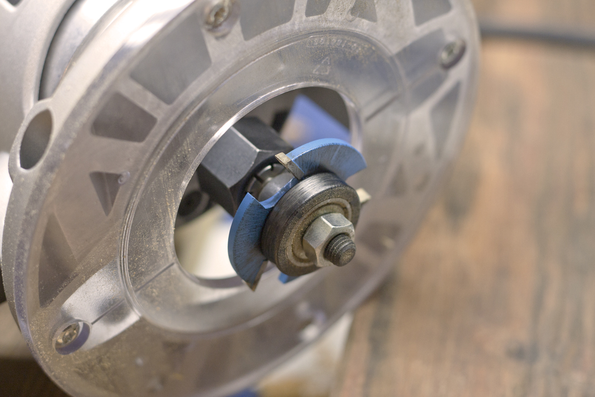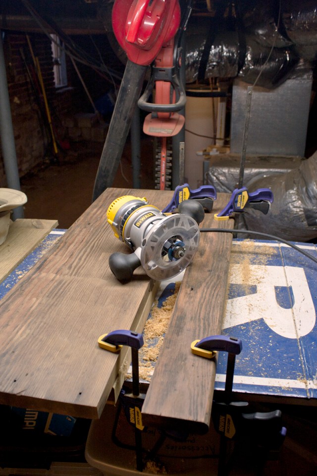 Here you see the basic setup. The two pieces are securely clamped to the bench (this is very important for safety reasons when using a router). The next photo shows the router bit used to cut the groove, or slot, in the two work pieces. I got mine from Rockler, and have been very pleased with it so far. It cuts through the heart pine like a knife through warm butter. The other option is to buy a biscuit joiner, which is a whole other power tool. Depending on how many biscuits you plan on consuming (ba dum), you might consider purchasing the dedicated tool. For limited use, I think the router bit will do just fine.