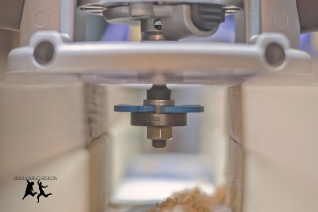 In the second photo above, you can see the grooves that were cut in each work piece by the bit. Since each piece is helping to support the router while you cut the other, the height of the cut will be exact for each piece. Side note: The blue part of the bit is the cutter. It is carbide tipped and extremely effective at ripping into wood. The graphite grey colored circle below the blue part is a bearing that doesn’t contain any cutting surfaces. When the bearing strikes the surface of the wood, it stops the bit from cutting any deeper. By changing the bearing, you can change the depth of the cut and, in turn, use different sizes of biscuits. Super fancy.