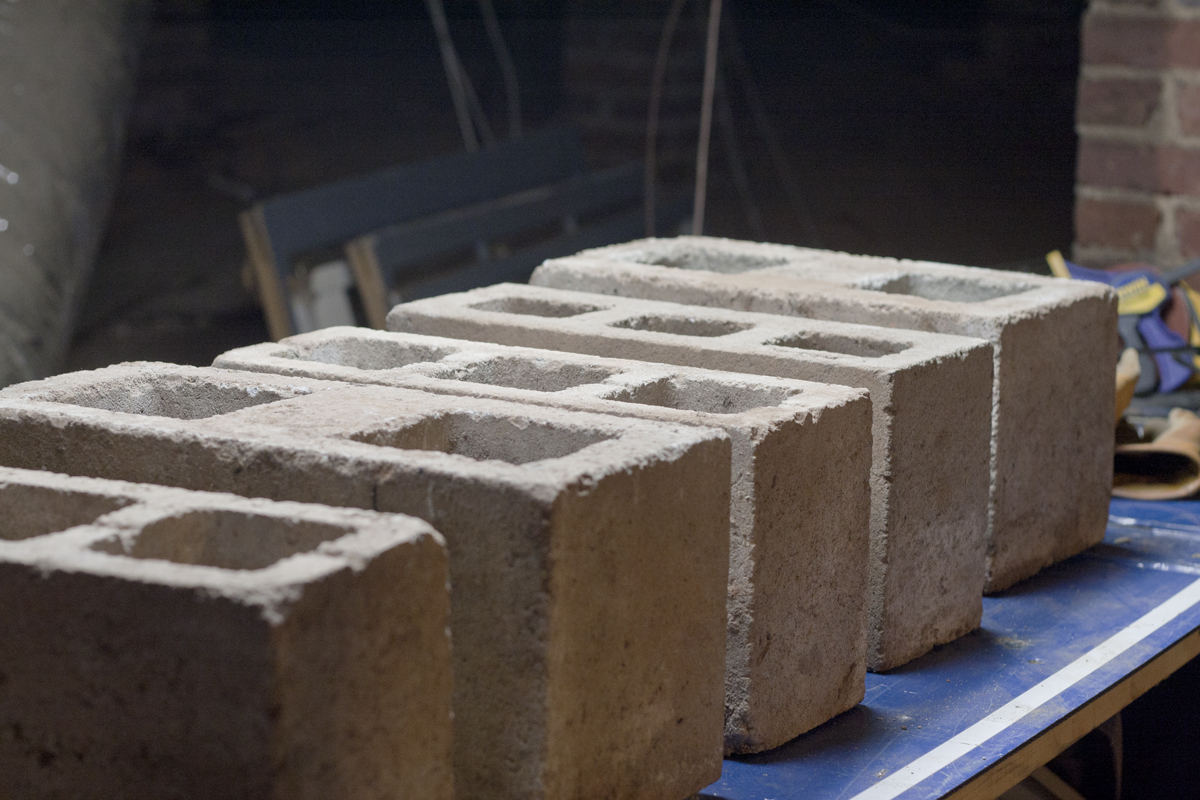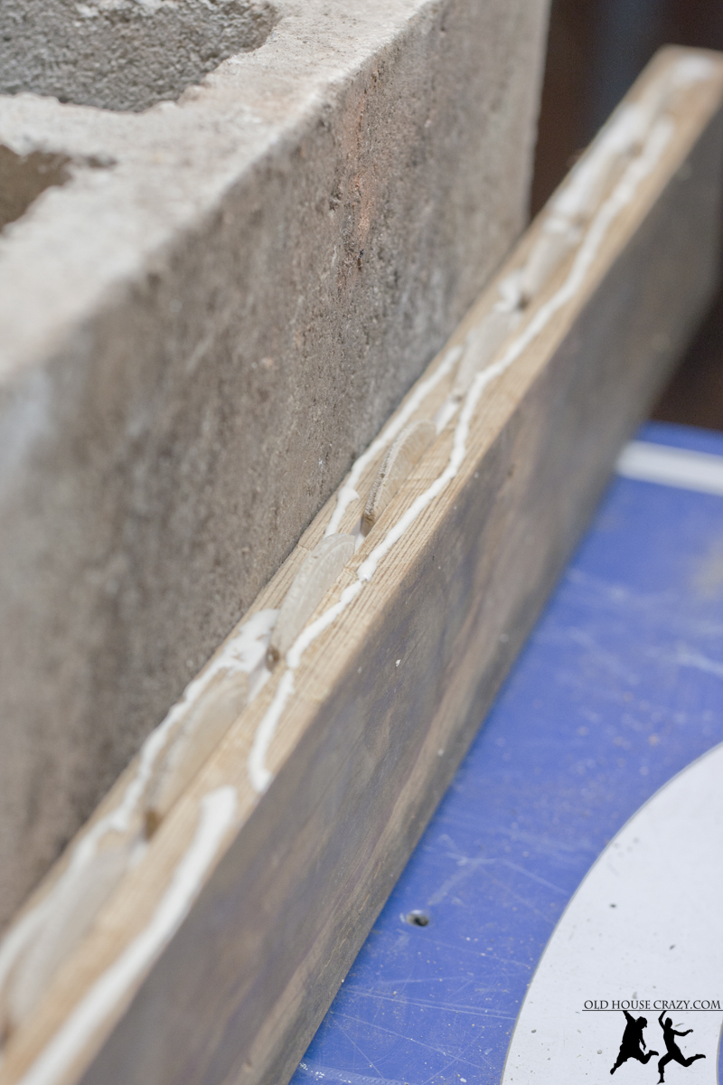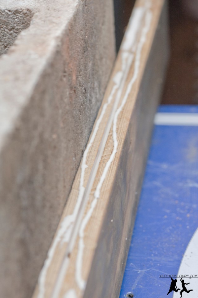 The series of photos below shows what I did after the grooves were cut into each of the 8 work pieces (glued together, they make four 15″ deep shelves). I set up cinder blocks to support the boards and allow me to add weight in lieu of clamps. It’s much more effective and professional to use clamps. They’re also expensive. I mean, it’s not bad to go buy one clamp, but I’d need at least 8 for this job.