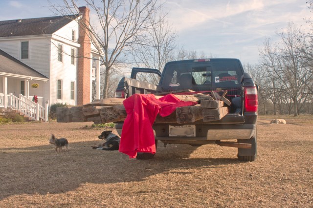 The first thing we had to do was find materials. Since this thing is supposed to be made out of reclaimed wood, I asked around and my Uncle Bob came through. As it turns out, Uncle Bob owns a farm in south Georgia and raized a few farm houses back in the 80’s. He stacked the timbers from those houses in a barn on his property to use as he needed. The houses he tore down were built between 1890 and 1910, so the timbers are at least 100 years old. In the photo below, you can see the greying heart pine timbers stacked where Uncle Bob left them 30 years ago.