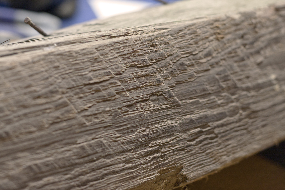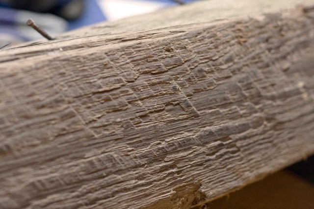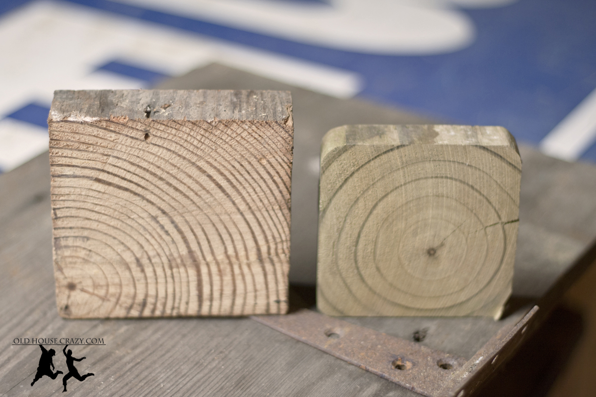 The photo above shows a slice from two 4×4 beams. The larger slice is from a heart pine beam from Uncle Bob. The small slice is from a treated pine post left over from building our fence. Both beams are 4×4’s, meaning they should measure 4 inches by 4 inches. Old houses are built from lumber that is true to its dimensions. New building standards have shrunken our timbers. A modern 4×4 is actually smaller than 4″ by 4″. The second thing to notice is the growth rings. You can see the center of each tree as indicated by the small circle. Note how close together the rings are in the heart pine timber. This tree grew slowly and developed over many more years than the newer beam. The new wood is much less dense and is the commonly known soft pine that most new homes are built of.