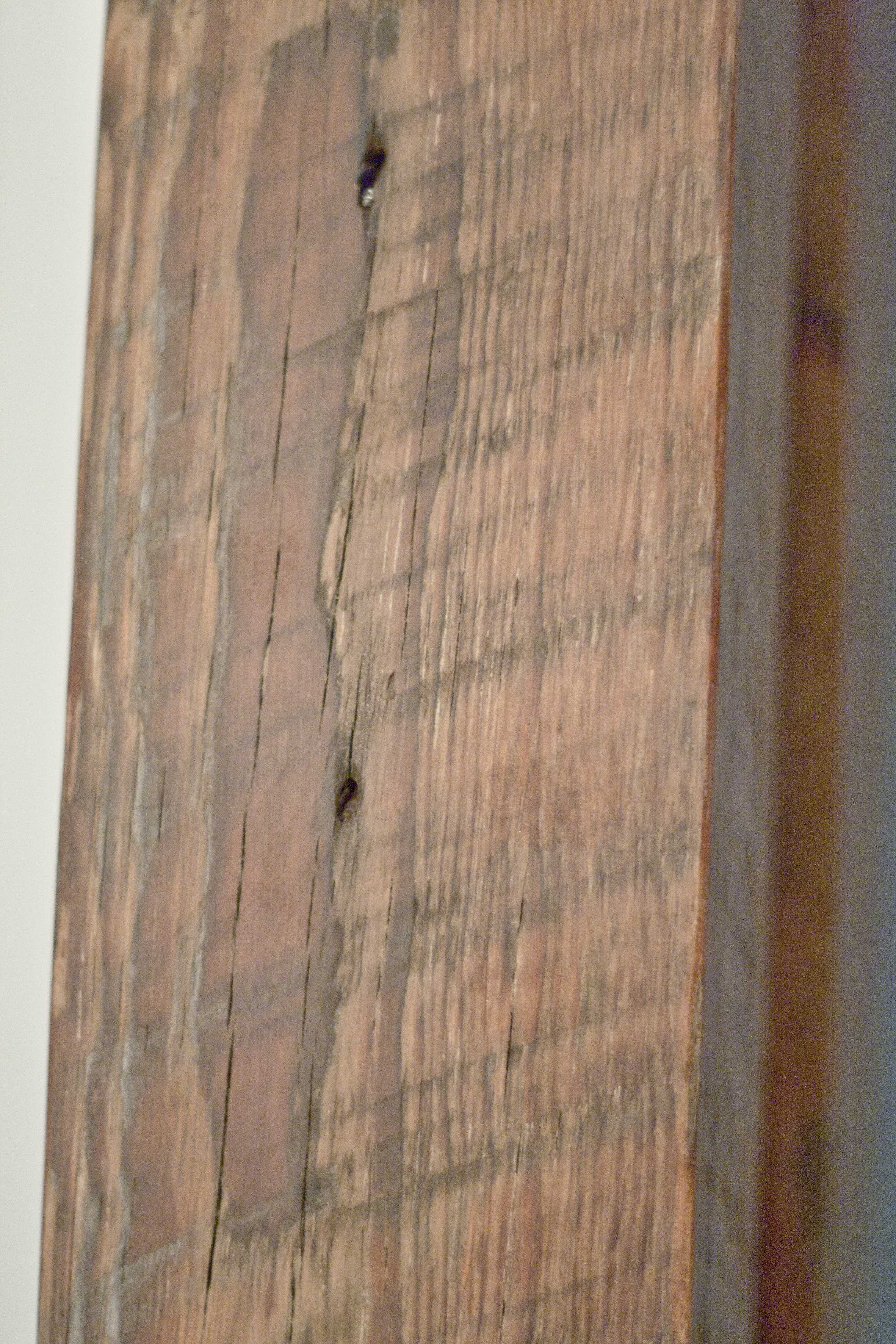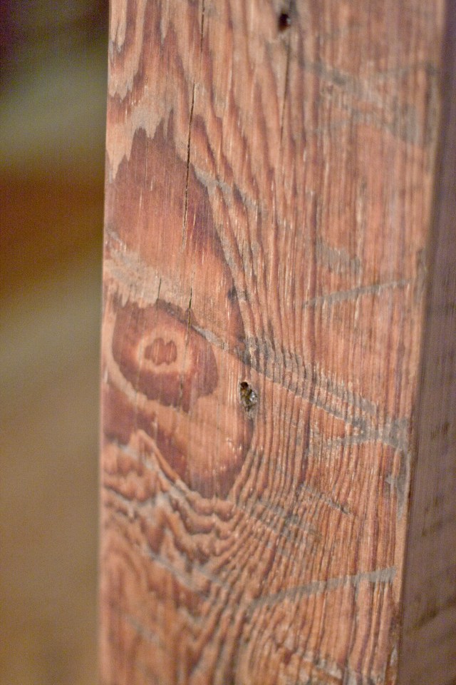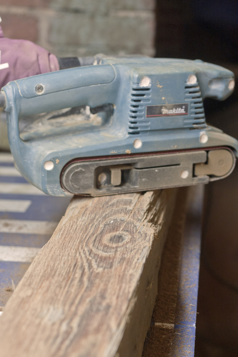 You can see in the photos above that the beams were very worn and faded grey. They also still contained the nails used to hold the old houses together. My first major project was to prepare the beams by removing the nails and sanding like a crazy person. I also decided to build a multi-level shelf as a warm-up for the table project. I used a hammer, rubber hammer, nail cutters, pliers, and a nail punch to remove all of the metal or push it far enough into the wood so that it wouldn’t damage my sanders.