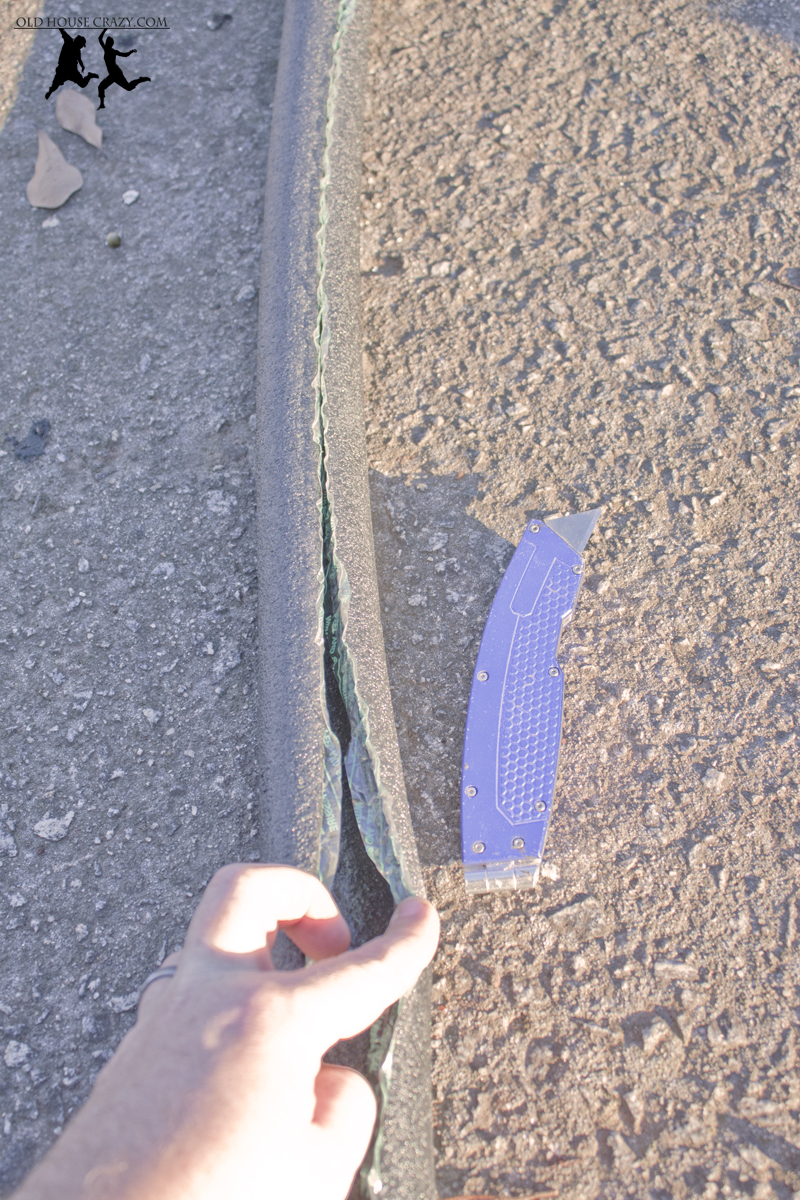 To complete this simple DIY project, I bought some pipe insulation from Lowes in two sizes. You just need to figure out the diameter of your pipes and read the boxes at the hardware store to figure out which ones to buy. The stuff I bought had glue on each of the surfaces for easy application. After cutting it to size, all I needed to do was peel off the backing and stick the sides together.
