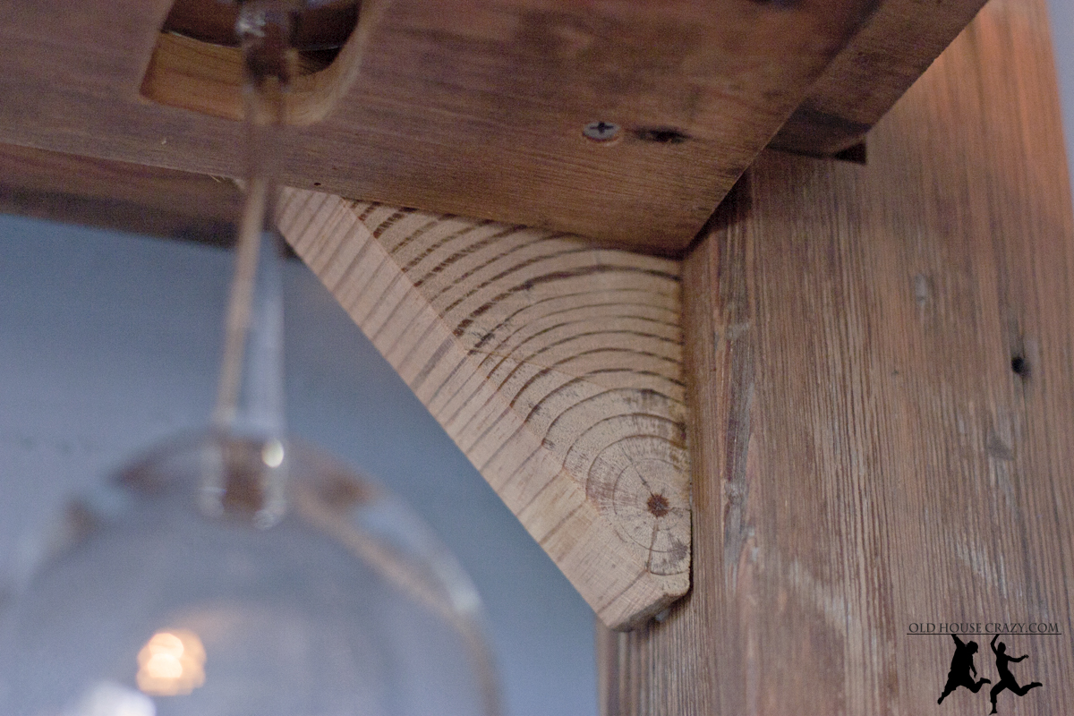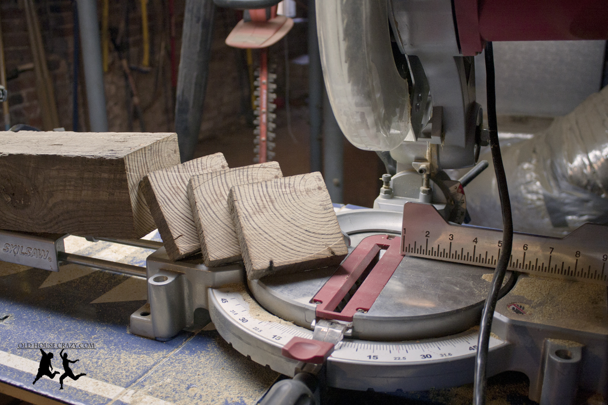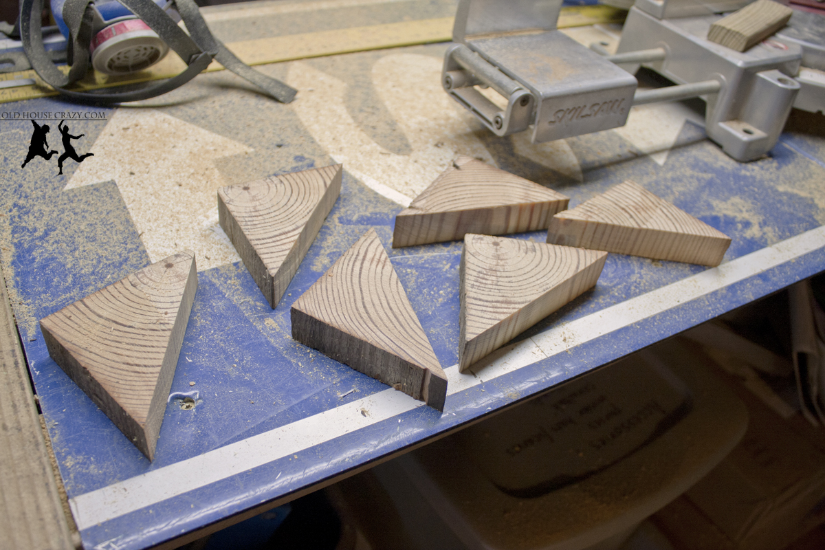 Using my chop saw, I cut one of the leftover heart pine posts into slivers an inch wide. Next, I cut those slivers in half to make heart pine triangles. This could have been done by hand if needed. You can also use any wood you’ve got, or purchase metal brackets that serve exactly the same purpose.