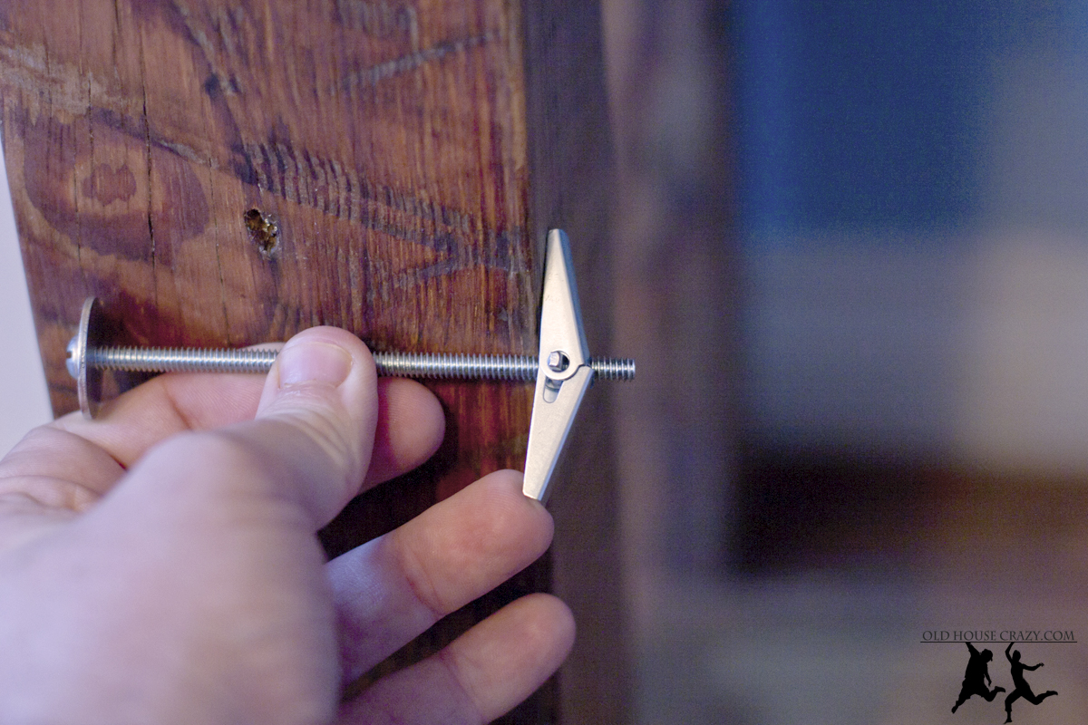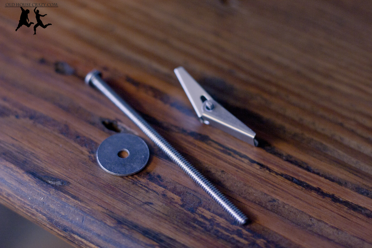 Now that the shelf was stable from side to side, I needed to make sure it stayed up against the wall and didn’t come crashing forward. The photos below shows a toggle bolt and how it works. The first shows the three parts you’ll need to buy. First, the toggle bolt itself. Then a long screw and a washer, sized to fit your needs. Go to your local hardware store and ask for the parts. If you go to one of the big box chains, they’ll sell you special mounting kits that are basically these exact parts, but for much more money. Note – These only work for hollow walls like ours, which are made of plaster. They also work on hollow walls made of sheet rock.