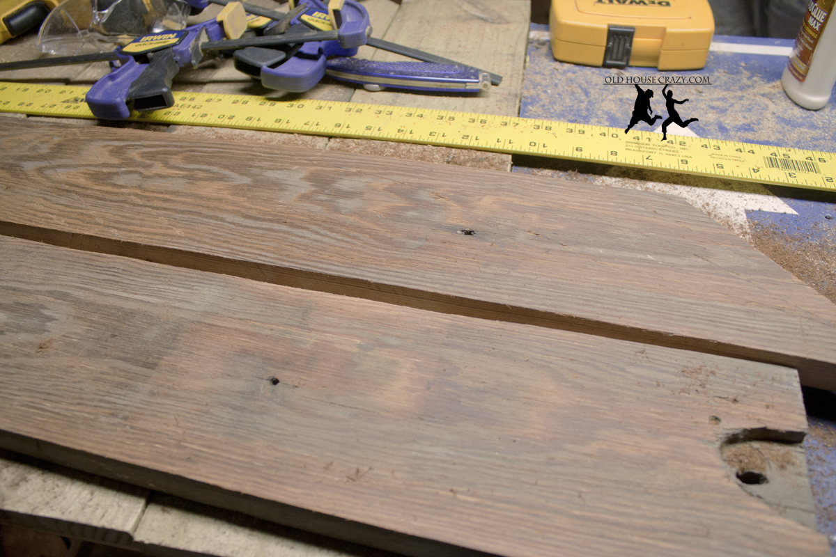 To improve upon the design I saw on Pinterest and to make this my own, I cut an old heartpine shutter into a five-inch wide strip and cut it to length to be a shelf behind the ladder sections. After it was sanded, I attached it to the ladder using biscuits. You can get more information on biscuit joinery here.