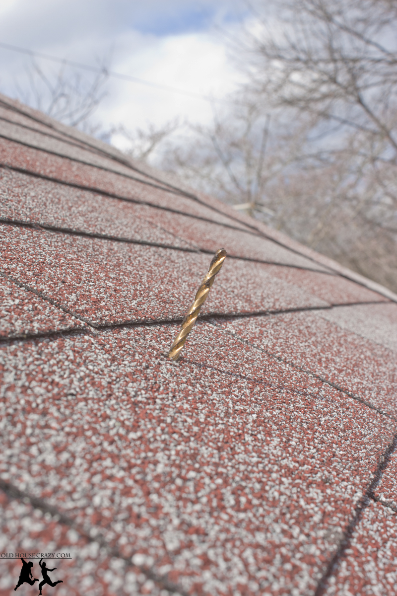 Down the attic ladder we went, climbing up the roof ladder to find our drill bit like little kids hunting for Easter eggs. Hooray! After we located the bit, we began separating the asphalt shingles and cutting out a space for the flange to go.