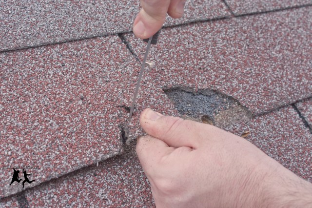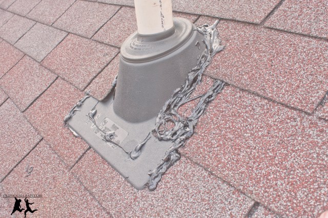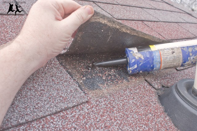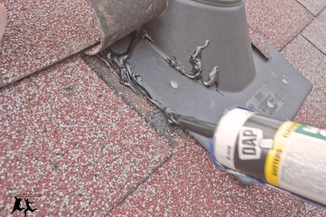 But wait! We just spent all this time being careful not to damage any shingles and then we stupidly drove nails through them!?! Isn’t that more holes in the roof. Yes. It is. But that’s why they make roofing tar, quite possibly the nastiest stuff on earth. Wear old clothes because once this stuff touches your clothes, it’s over. They’re ruined. We bought a tube of tar (you need a caulk gun) and used it to reglue the upper shingles down, cover the nail heads, seal all of the edges, and patch a few other vents on the roof that had started to crack. This stuff is also great for sealing leaking gutters or any other places where water leaks.