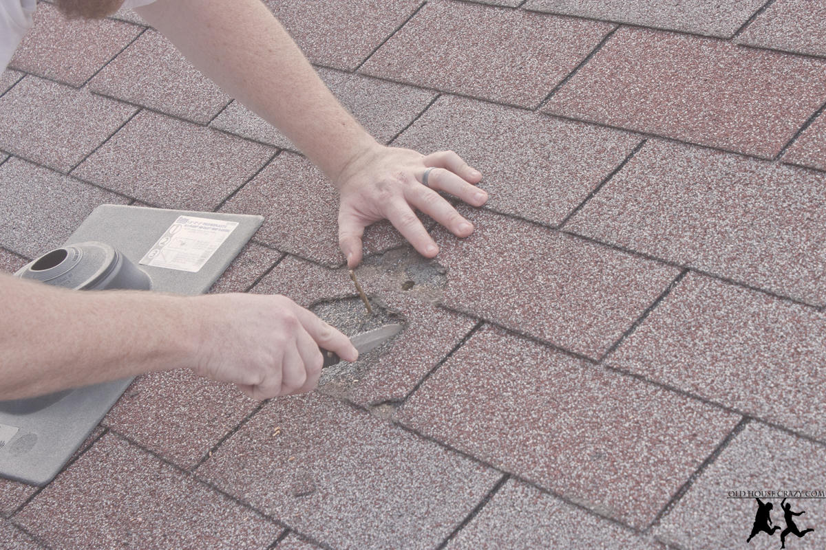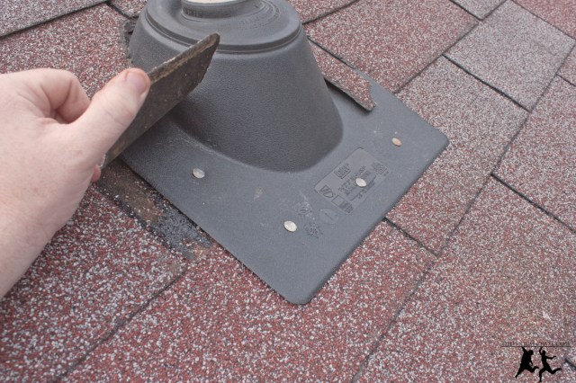 The flange needs to fit snuggly around the vent pipe and should go under as many layers of shingles as possible. Furthermore, the flange should only be exposed on the bottom half (the upper half should be covered by shingles). Asphalt shingles are brittle when new, so we were extra careful not to damage any shingles that we didn’t need to. These were not new, so this took some care.