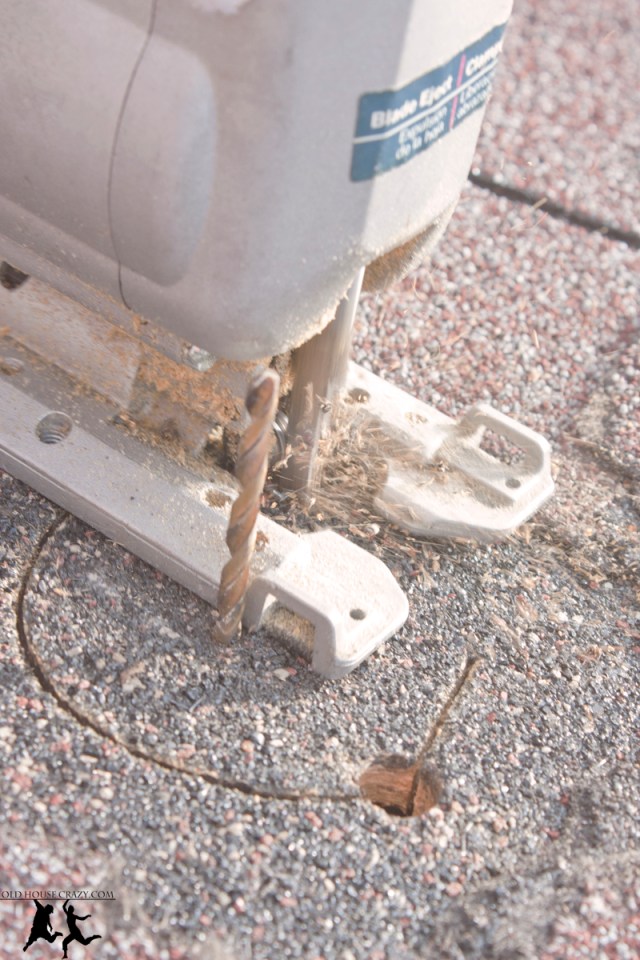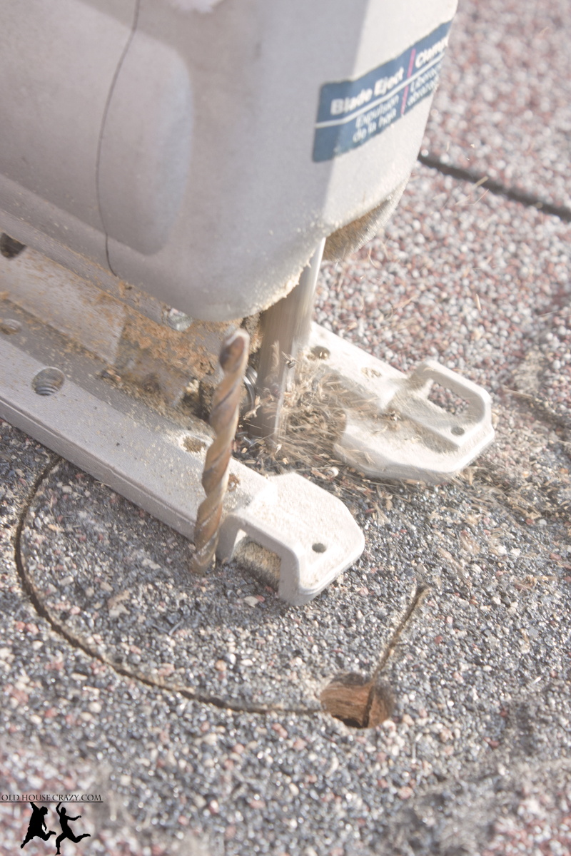 Once the shingles were prepared and some nails were removed (lift up the shingles and pull out any nails that are blocking your flange from sliding up), we used a drill to make a pilot hole, and then a jigsaw to cut out a circle roughly the size of our pipe. The hole needs to be taller than your pipe diameter, as the pipe isn’t passing through the roof at a perpendicular angle.