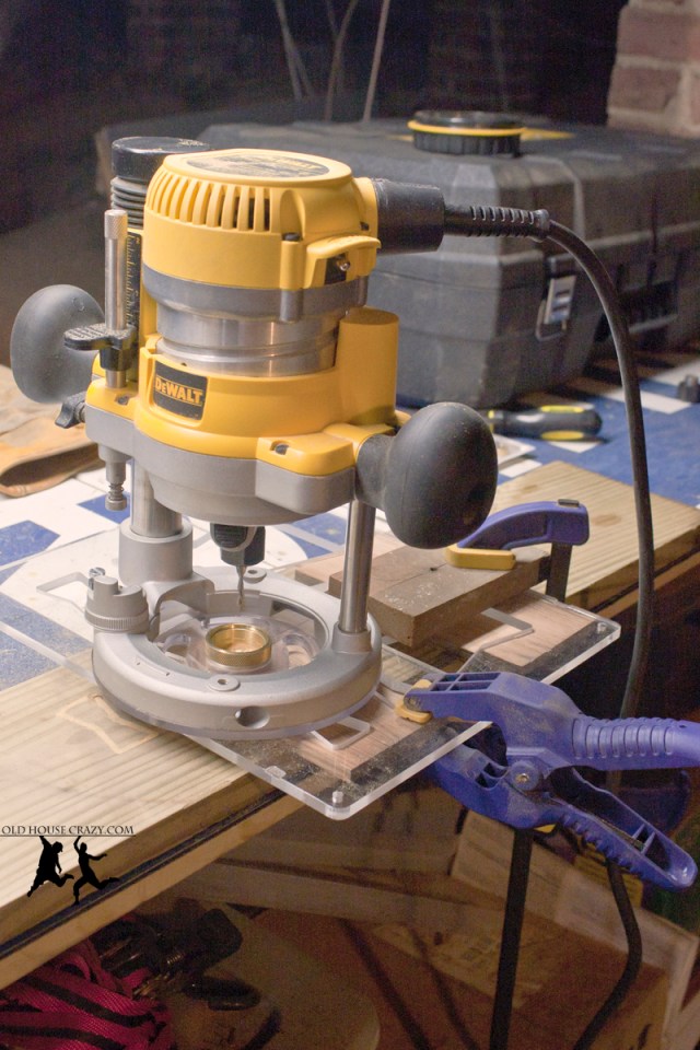 The wood glueing is pretty self-explanatory I think. Squeeze some glue into the crack and clamp the crap out of it with as many clamps as you’ve got. Check. The butterfly joinery part is a little more fun and intricate. It involves cutting a butterfly shaped piece of hardwood and inserting into a butterfly shaped hole across the crack you’re repairing. In order to cut the butterflies, I used a template I picked up from Highland Woodworking supply in the Virginia Highlands (that’s a neighborhood in Atlanta). As you can see in the photo above, I’ve got everything clamped down firmly so that the router’s inlay bit won’t move things around as it cuts.
