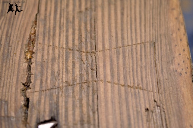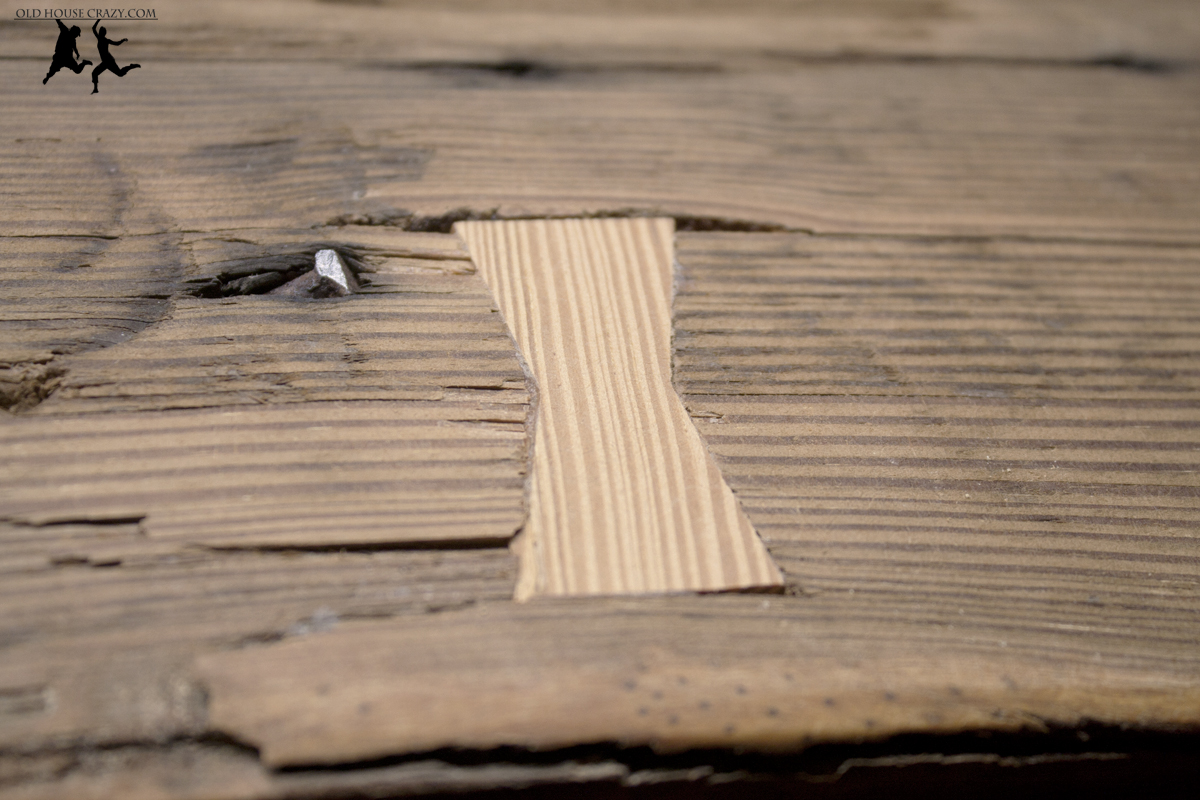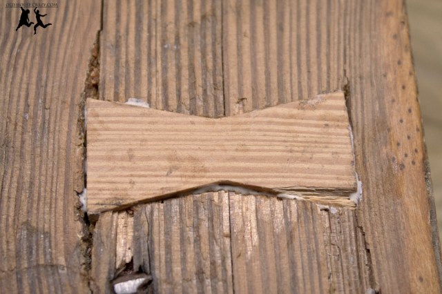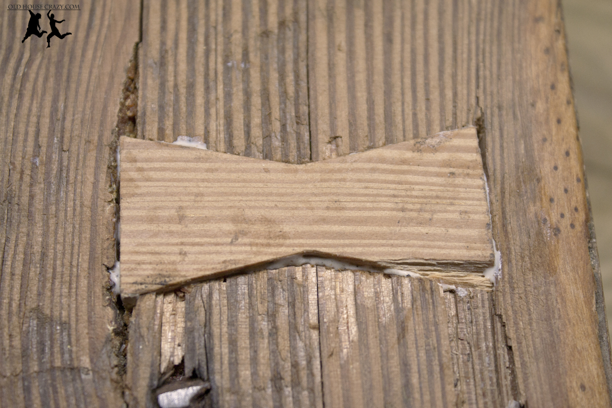 During the sanding process, a long crack in one of the legs became more pronounced and noticeable. Since this beam was cut from almost the very center of the tree, one corner of the beam shows a quarter circle of rings that are very small. This center section of tree had started to separate from the rest of the beam, and the crack ran almost halfway down this particular leg. In order to repair this crack and stop it from spreading, I used two techniques: wood glue and butterfly joinery.