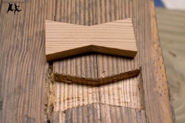 After the hole was cut, I added some glue to all sides of the butterfly and a little into the hole and hammered it in with a rubber mallet. It’s not a perfect fit, but it’s not too bad for my first one cut by hand. I actually cut two more for the same leg and each one was a little better than the last.