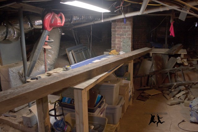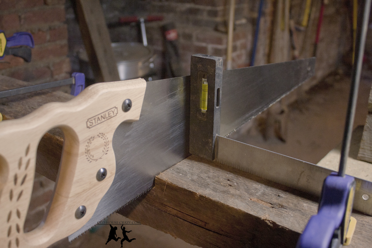 After I mostly finished the table top (more on that later), I needed to start thinking about the under structure for our heart pine farmhouse table. The legs and aprons would have to be super sturdy in order to support the top, which is easily a hundred pounds of lumber. For this purpose, I selected the heaviest beam from the lumber that Uncle Bob and Aunt Gail gave to us in December. This 12-foot-long 4×6 beam was a monster, and was quite awkward to carry into the crawl space for cutting.