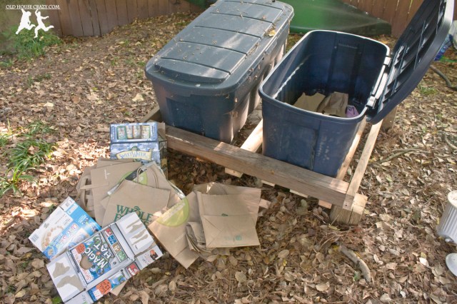 The bin on the left is the one we started last year. It’s a 50 gallon rubbermaid trunk. It cost 25 bucks, is waterproof, and has a pretty good seal around the lid to keep in the worms. It wasn’t in that fancy wooden rack until today. In anticipation for the second bin, I built that rack out of treated lumber I had sitting around. It really looks a lot like a pallet and is sitting on 12-inch legs in the back and 6-inch legs in the front. This helps drain the water out of the bin so the worms don’t drown.