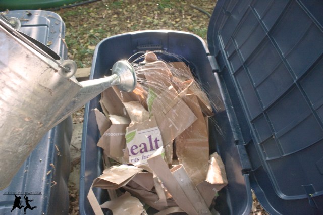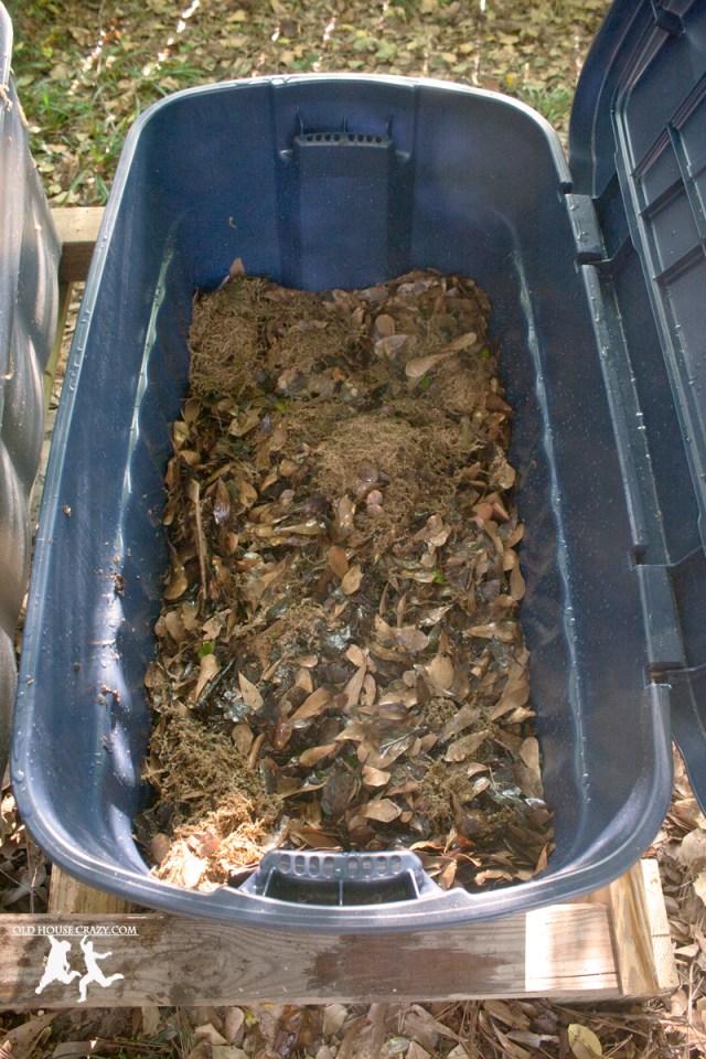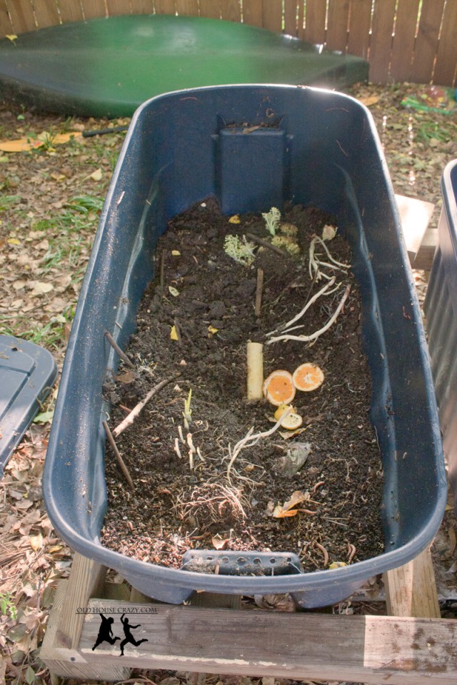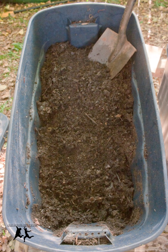 It compressed nicely when I pressed it down with a shovel. On top of the cardboard I dumped a five gallon bucket of the junk I pulled out of our gutters today. Some sites say never to put leaves or other yard waste into your bin because it may contain other critters that could be harmful to your worms. This is a good point. You can substitute some old green stuff from your kitchen in this step – kale, mustards, broccoli, etc. Use the plants of old veggies after you’ve picked the veggies.