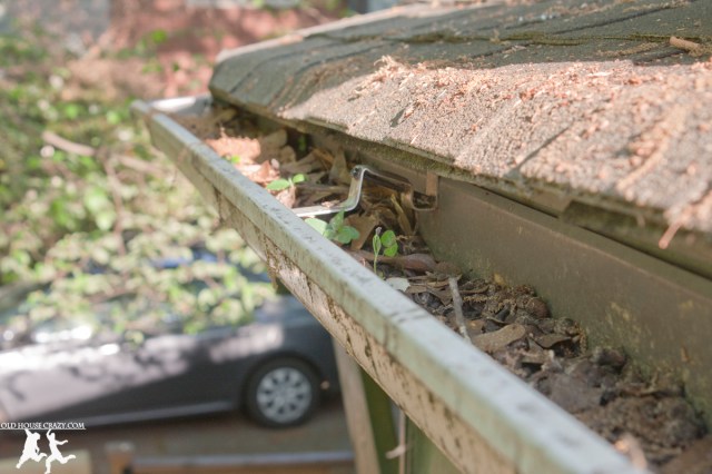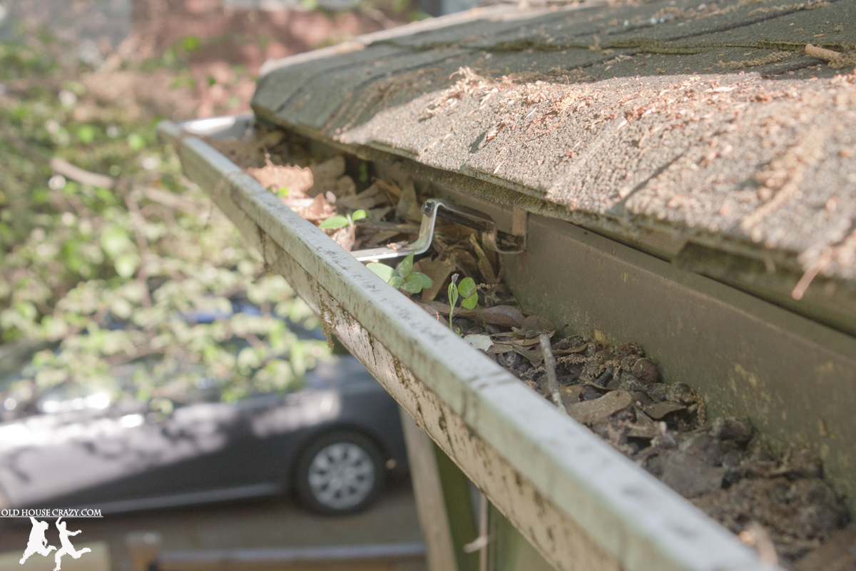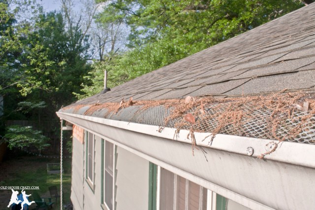 At this point, you might be wondering if you can just keep the leaves out of your gutters. TV commercials tell me there are literally hundreds of ways to keep leaves out, and ALL of them work and are easier than cleaning out your gutters. Sure. Go for it. As you can see in the photo above, I installed screens on my gutters all the way around two years ago. The stretch of gutter in the photo is the only stretch where the screens are still in place. Notice how much shade you see in the photo. The lack of shade indicates a lack of trees over these screens. Yes, this gutter was still clean. Yes, its screens are still in place. But there are no tree branches over it to fall and knock off the screens. There are also hardly any leaves falling on this section of our house. The screens have done a fantastic job of keeping out the nothing that falls on them. Everywhere else, the screens let in leaves and I had to peel the screens off in order to clean under them. They’re a waste of money. Don’t buy them.