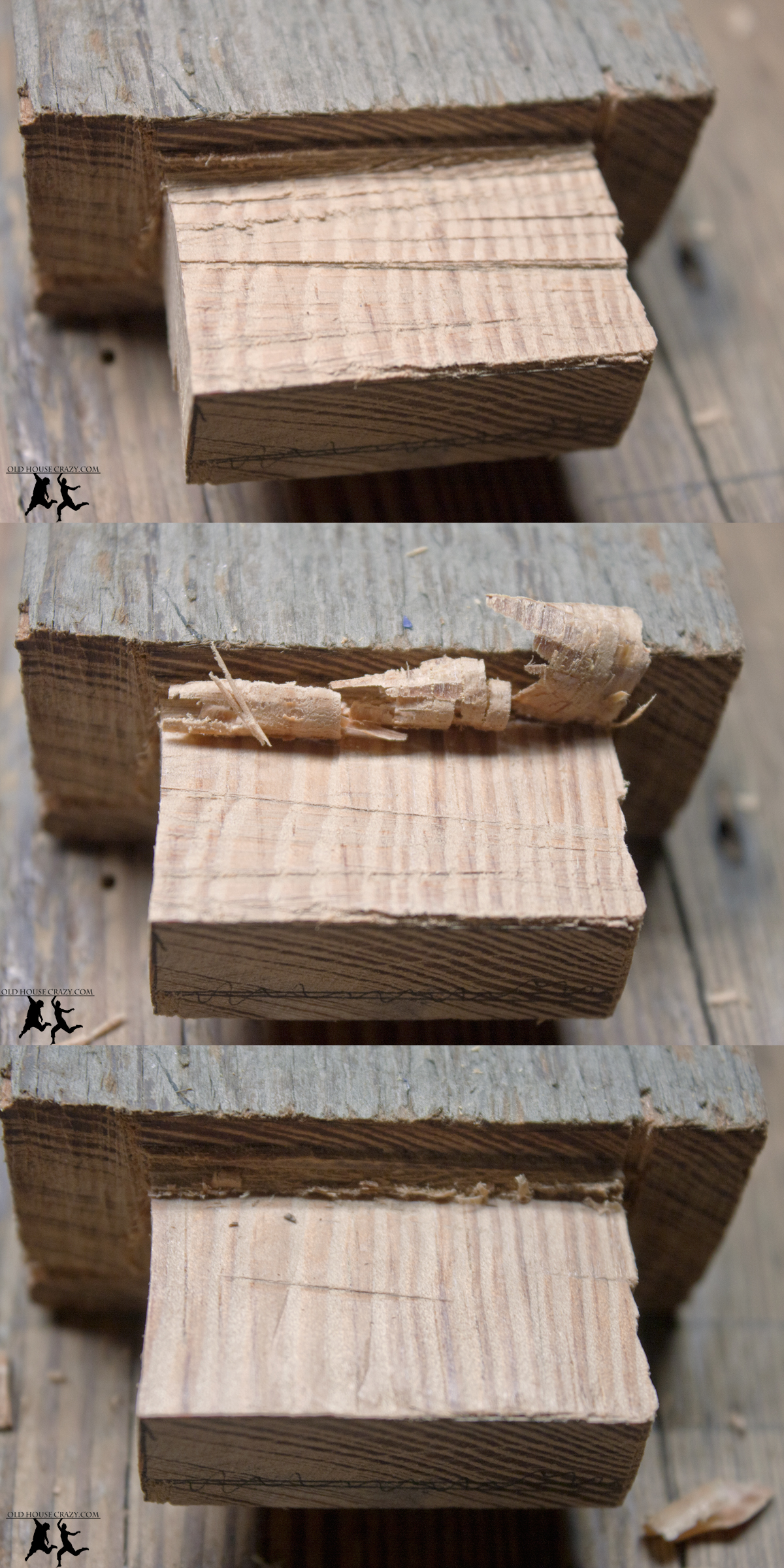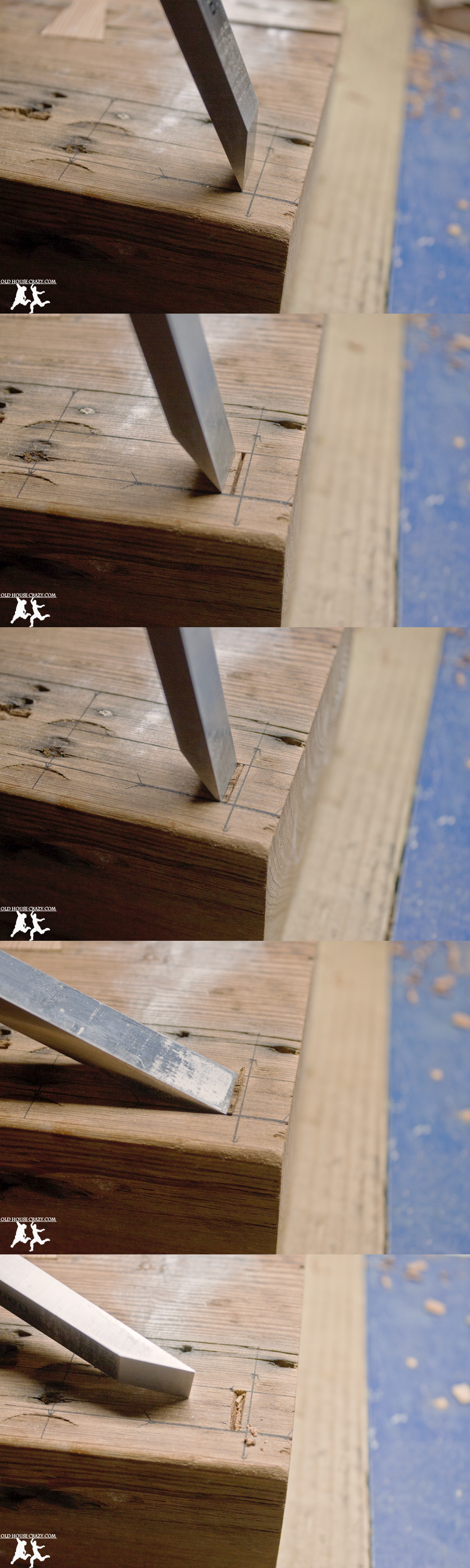 If you scroll up a bit, you can see a series of five photos that illustrate the method I used to cut the eight mortises for this table. I purchased a mortising chisel that was exactly the width of the mortises I wanted to cut. After marking the location for a mortise, I placed the chisel just inside the area I wanted to remove. A swift strike with my rubber hammer cut a groove in the surface of the wood. I then moved the chisel about an eighth of an inch further along and struck it with the mallet again. By leveraging the chisel I removed a tiny bit of scrap wood. I continued this pattern until I reached the end of the mortise. Then, I turned around and went in the other direction.