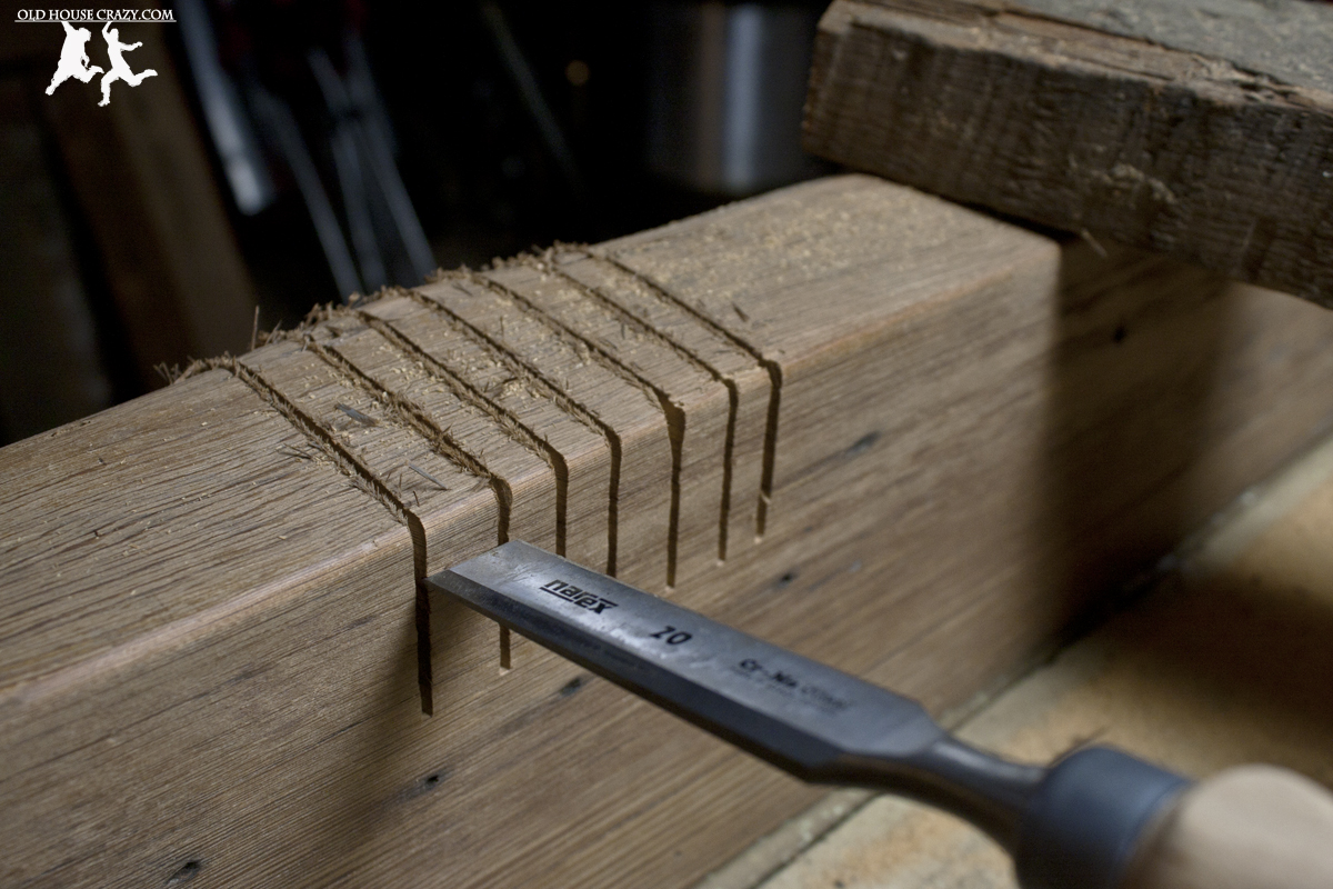 Once I had all of the mortise and tenon joints cut and adjusted, I cut large mortises for the framing boards and the stretcher that would extend between the legs of the table. I did that by cutting several grooves with the circular saw and chiseling out the waste.