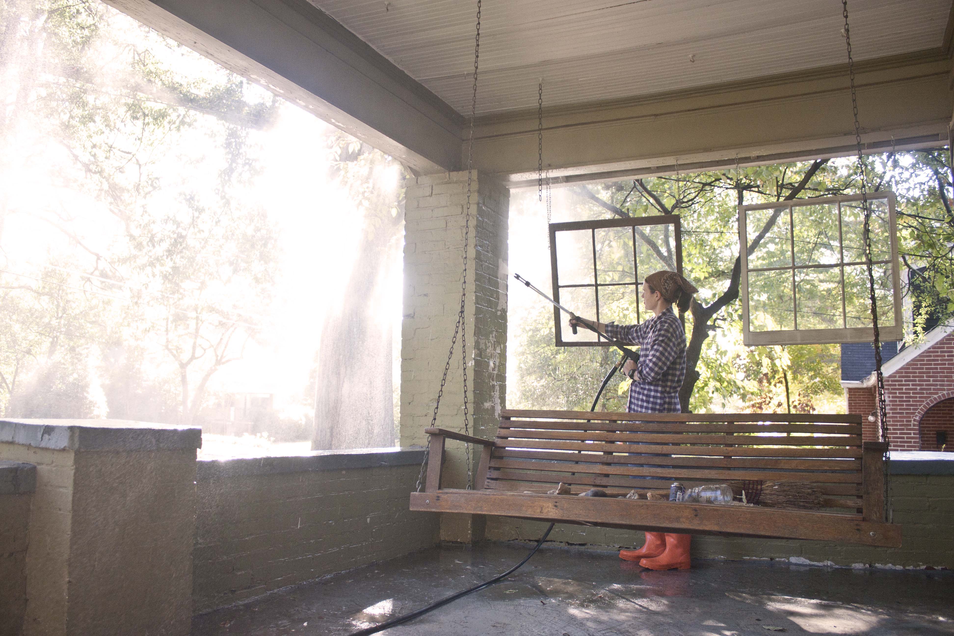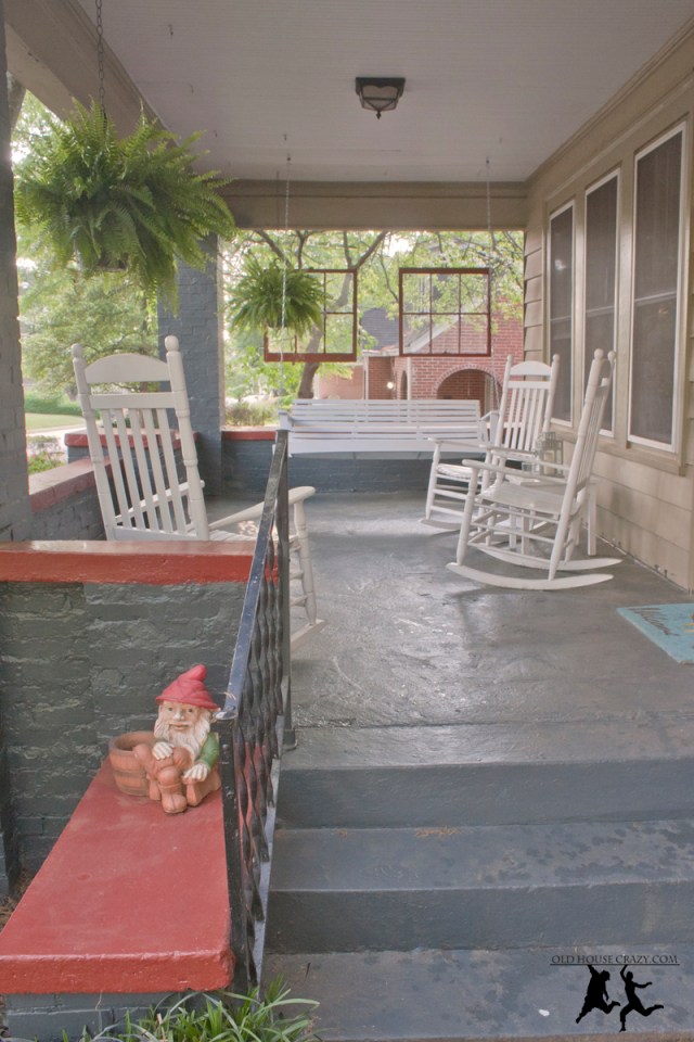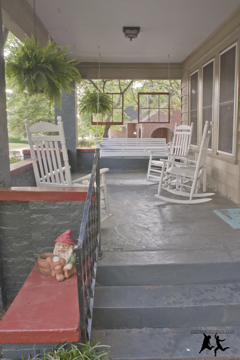 In addition to the floor and masonry paint job, Robby took our sad, chipped-up porch swing and sanded and painted it to match the rest of our white porch furniture. Instead of mis-matched furniture that, although not immediately noticeable and bothersome, was distracting, we now have a nice, subtle flow of clean, white furniture on the porch. While Robby had the swing down for painting, he also took the time to move the hooks a little farther toward the edge of the porch to give everything else a roomier, less-crowded feel. He also re-painted the hanging window sashes to match the red accent color of the porch rail, which ties them back to the house nicely, whereas before they were neat, but semi-random porch decor.