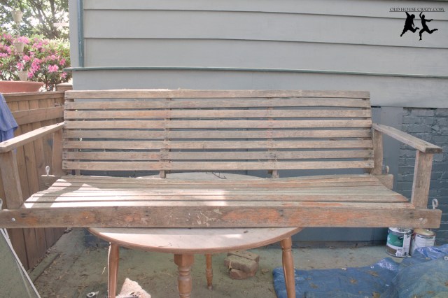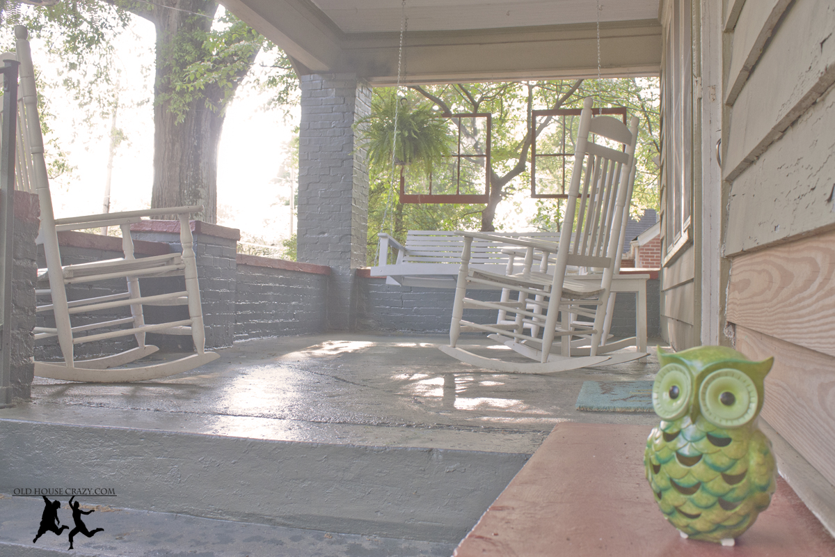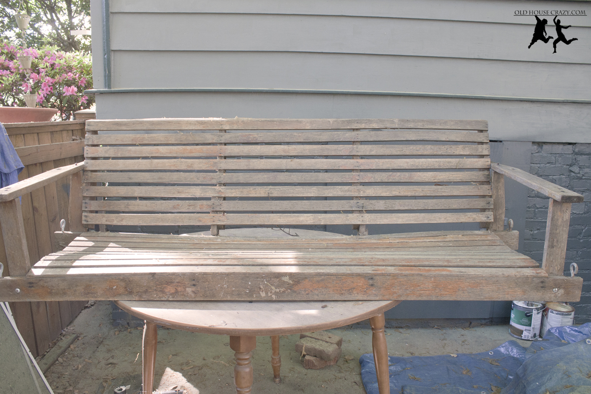 (The above photo shows the old paint color, porch swing that needed some love, and mis-matched hanging window sashes)