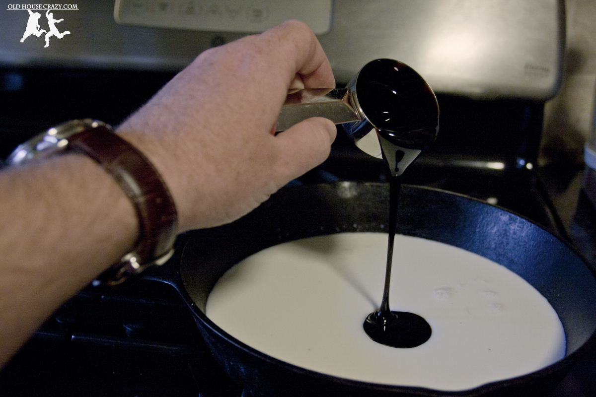 1. In a small saucepan over low heat, combine the milk and molasses. I prefer cast iron for its slow and even heating properties.