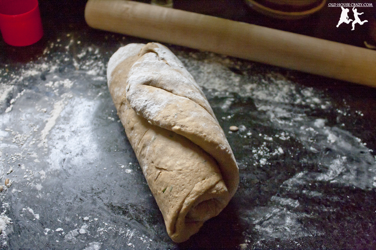 15. Roll the dough into a 12 by 7 inch rectangle and beginning on the short side, roll up loosely and pinch the seam to seal.