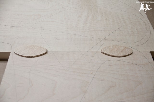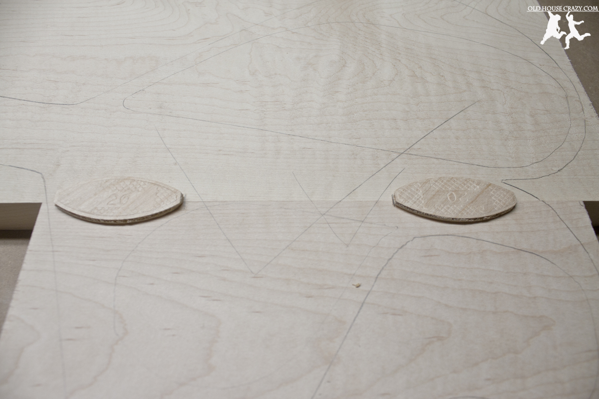 Once the boards were perfectly flush, I traced the design of the insignia onto the boards with a pencil. It fit very nicely. For the actual joinery, I used two biscuits, cut into the thickest parts of the insignia.
