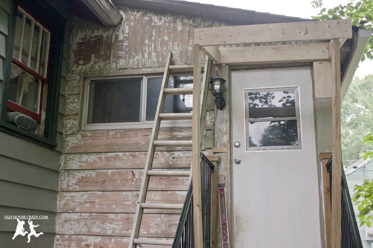 When we bought the place, the back door was covered by one of those hideous aluminum awnings that people put up in the 50’s. Gross. We took that down and I built us a new one out of cedar. We also had wrought iron rails put up on the stairs to replace the iron piping that had been there.