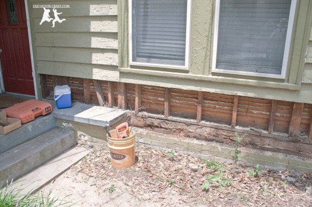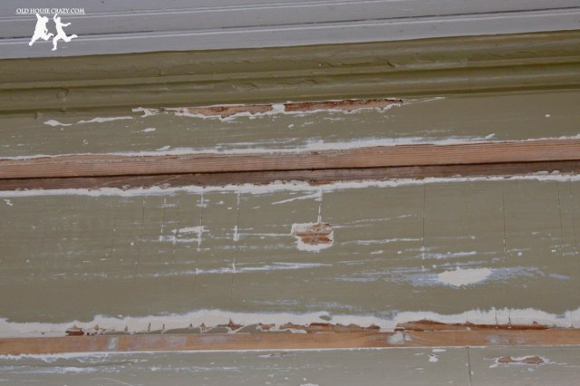I didn’t scrape all of the paint off of the siding under the porch. This paint was still in pretty good condition, so I scraped the bad stuff and patched the imperfections.