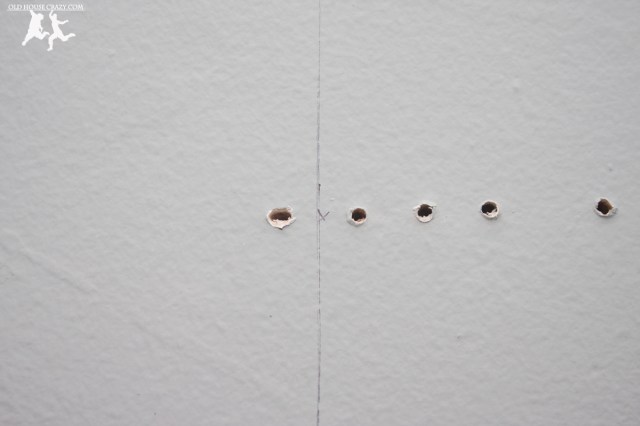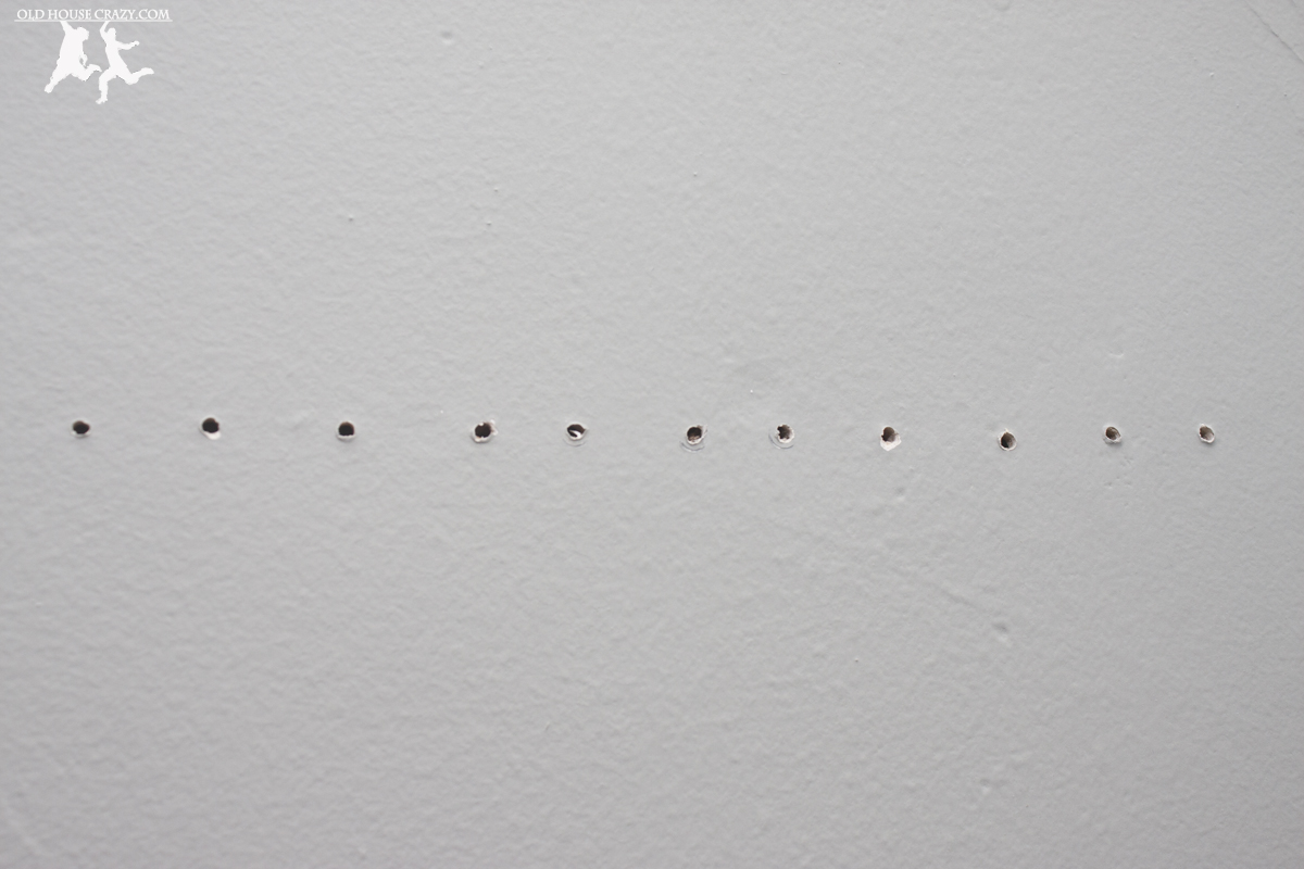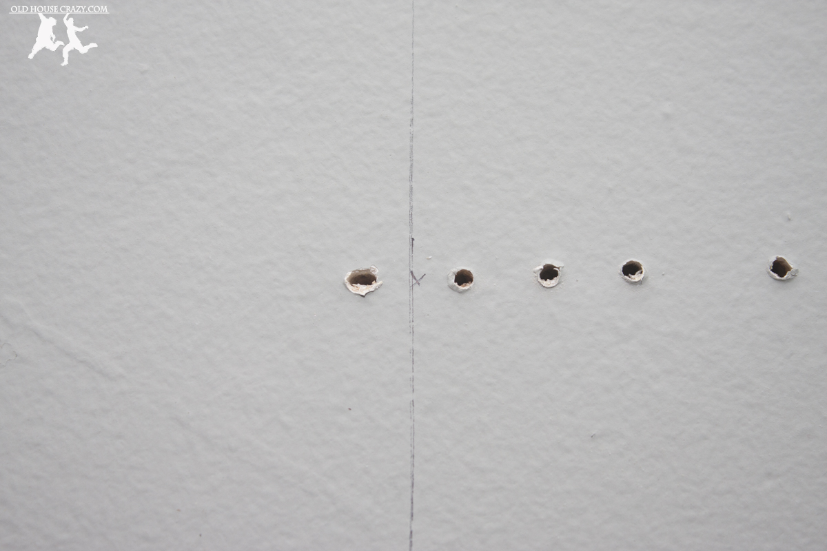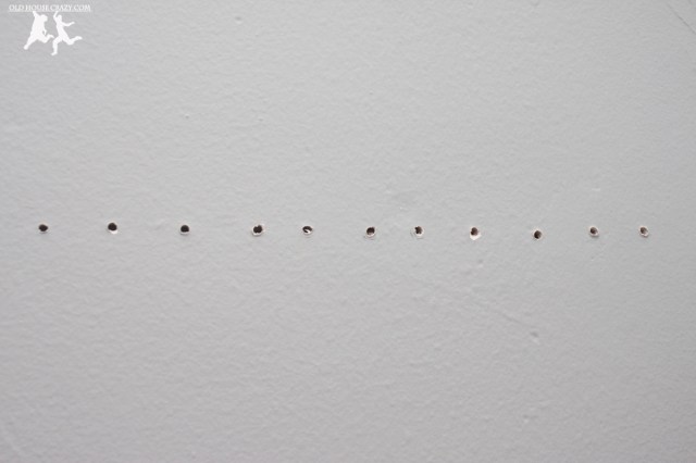 I drilled lots of little holes looking for the studs. Since we have plaster, a stud finder doesn’t work. These holes are hidden behind the TV now, so it’s all good.