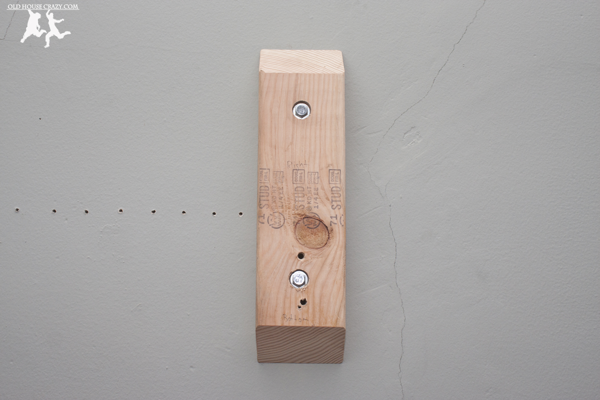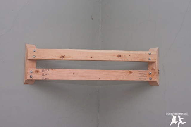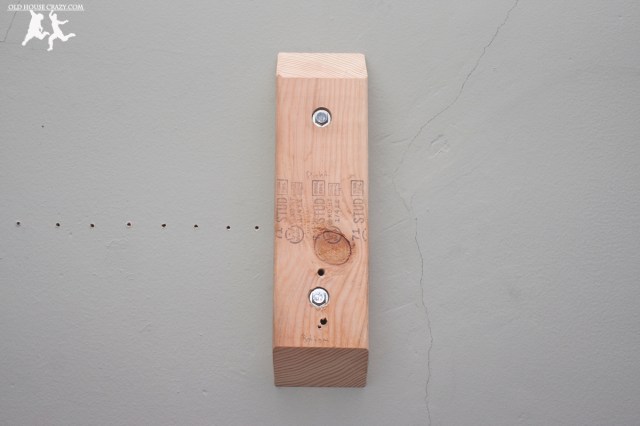 The third photo shows the base boards I bolted to the studs through the plaster. I cut two 18-inch sections of 2×4 with mitred ends (for looks, not required). I then drilled holes through the boards for 6-inch lag screws. I used a 3/4-inch drill bit to widen the hole on the top so that the washers and screw heads would be even or below the surface of the boards. This was important because I would be mounting other boards directly over the lag screws. I pre-drilled holes into the studs for the lag screws so that they would be easier to drive into the old wood. I used a level to make sure the base boards were perfectly vertical on the wall before I pre-drilled those holes. Even with pre-drilled holes, the screws heated up quite a bit as I fought them into the studs. I would highly recommend you twist one screw for a few turns, then move on to the other. Feel them with your fingers to make sure they’re not too hot. Let them cool for a while if you have to. If they overheat, you can twist the head off of the screw. . .and then you’re screwed.