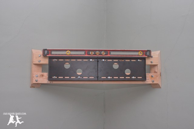 Since August, we’ve had the tv sitting on the same tired old table where the old tv had been sitting. Both Christy and I have wanted to mount it on the wall, in the corner above the outlet, but the cost of those metal mounting brackets kind of scared me. Some of those mounts run upwards of two hundred bucks. Plus there’s the fact that our walls are plaster and we’ve found the spacing of the studs in our crazy old walls to be less than reliable. This is a problem if your store-bought mount only allows for screws in certain standard spacings.