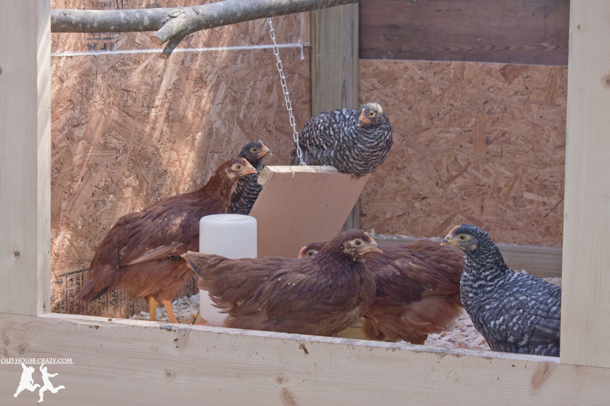 Looking through all of the photos included with this post, you can see black chicks, light brown chicks, and yellow chicks. The black chicks are Plymouth Barred Rocks. The light brown chicks are Rhode Island Reds. The yellow chicks are the roosters that we gave away. The photo below shows our Rhode Island Reds and Barred Rocks after 10 weeks in their new home, the chicken coop. I’ll write a post soon about building that coop and the fun that these chickens have provided to our little urban homestead.