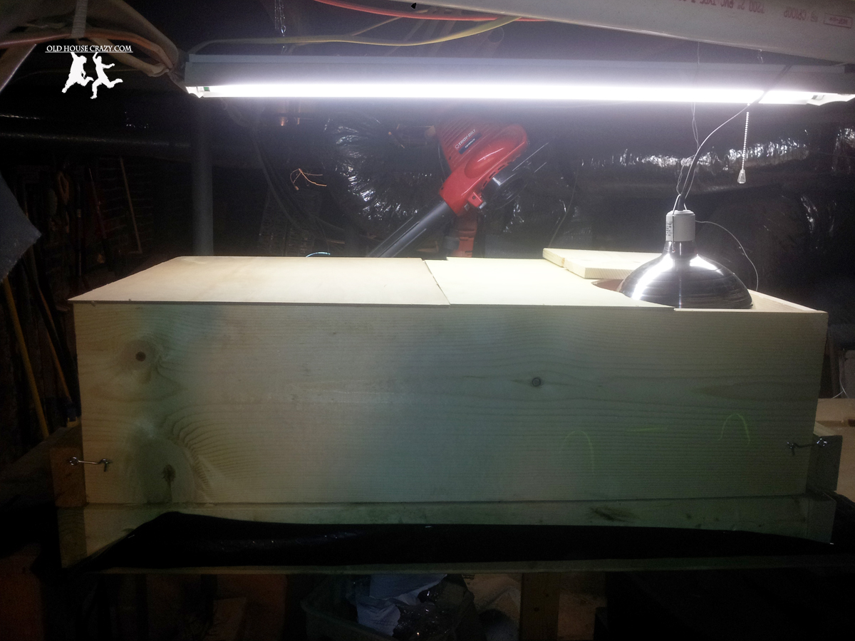 I decided to build a brooder for the baby chicks so that they’d have a nice warm place to grow up for the first few weeks of their lives. I say decided, but really you must do this or they’ll all die from exposure. Since you, instead of a mother chicken, are raising the babies, you must have a really warm place for the chicks that imitates the underside of a mother chicken. This is accomplished using a heat lamp, which can be purchased at any pet store or Tractor Supply Co. From the photos above and below, you can see the brooder I built for the baby chicks and the heat lamp that is hanging a few inches above the brooder floor. I actually lowered it another few inches down from where it’s hanging in the photos so that the birds were warm enough. As they grow, you raise the lamp up a little each week so that the temperature gradually decreases to room temperature.