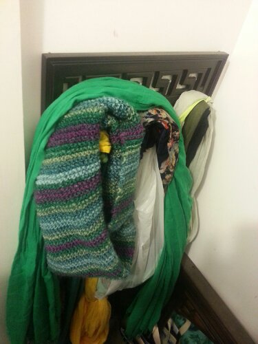 I’ve had a rinky 3-peg board on my side that doesn’t even pretend to hold half of my scarves, yet alone any bags or purses. The first step was to remove the 3-pegger, which took two seconds since I installed it before our adventures in hanging heavy stuff on the walls taught us how to hang things correctly!