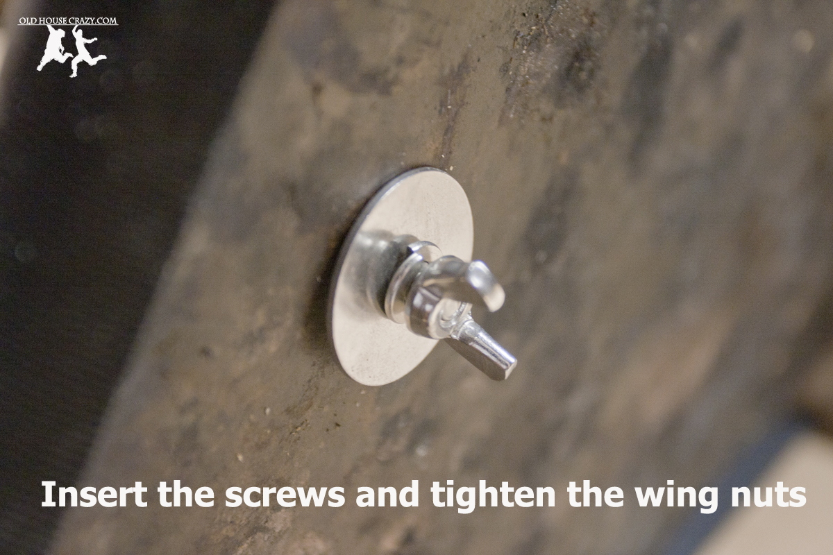 After your holes are drilled, insert the screws through the holes and attach a large washer, then a lock washer, then the wing nut. Tighten the wing nuts firmly.
