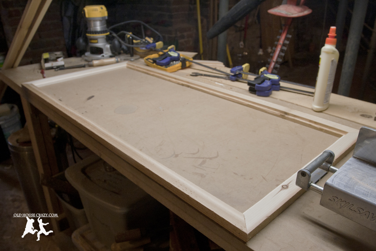 I cut out a groove in the side of the cedar 1×2 using a straight cutting bit and my router. When the frame is assembled, the oak panel will sit in the groove.