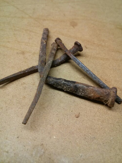 We’ve got this 2.5-quart bucket full of rusty old nails that were pulled out of the wood we turned into our dining room table, shelf, and photo shelves. I’ve thought about using them for a crafty DIY project but I haven’t really figured out what to do. They can’t be re-used strictly as nails, so I figure they’ve got to be incorporated into something else. My ideas are to pour some clear plastic or epoxy over them and into some type of mold to make coasters or trivets or build them into a picture frame. What are your thoughts? Any ideas on what I should do? Should I clean them up or leave them rusty?