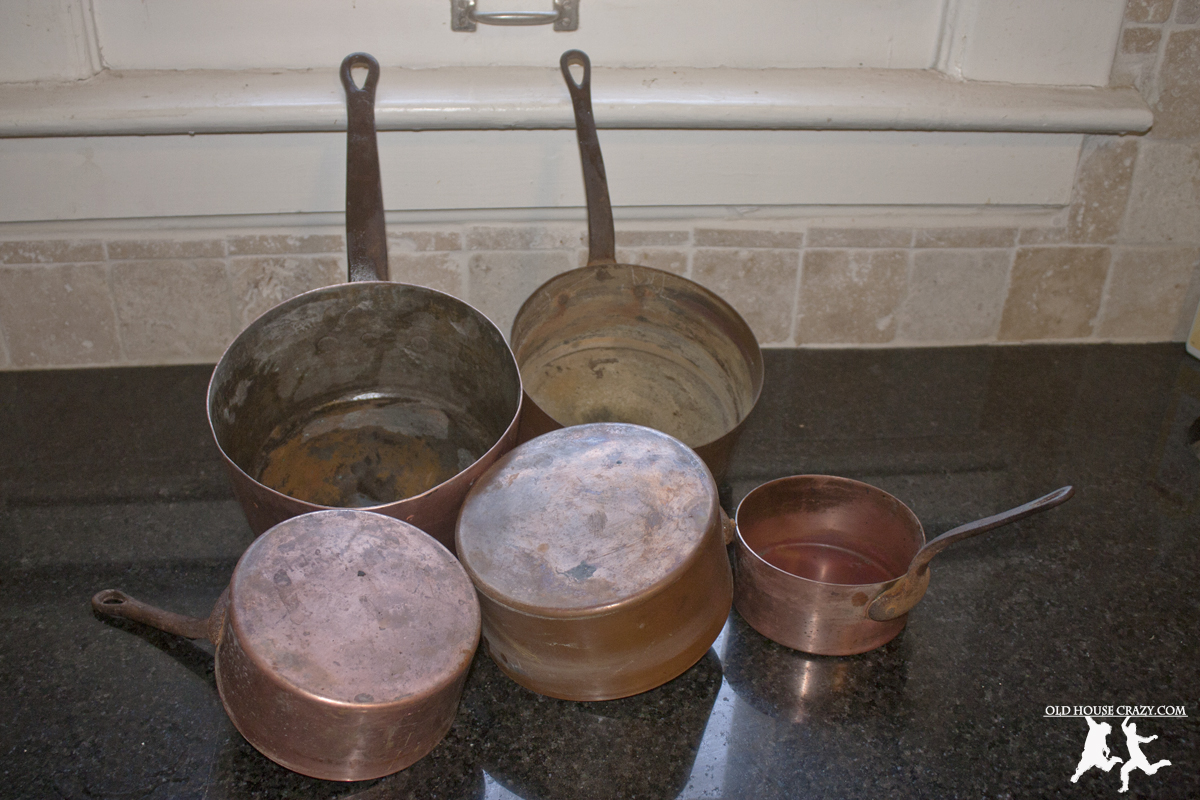 Instructions: In the photo above, you see the set of five solid copper pots that we bought at an auction. They nest inside one another and are really heavy. As you can tell, they were really tarnished and kind of nasty when we bought them, so we needed to clean them up if we were going to display them in the house. I used copper polish that I bought at the hardware store, some hot water, and some elbow grease to clean them up. It took about an hour of scrubbing to get them shiny, but they turned out incredibly. Copper is such a beautiful metal.