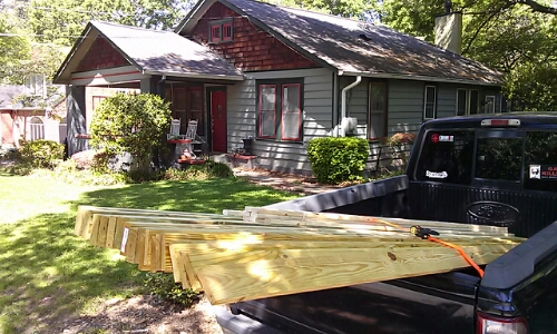 Yesterday was our fifth wedding anniversary, which is traditionally celebrated with gifts of wood. We decided to forego individual gifts and build a wooden project together. This is the first load of wood for a two layer garden box that will sit under the window on the front of the house. More photos and instructions to come.