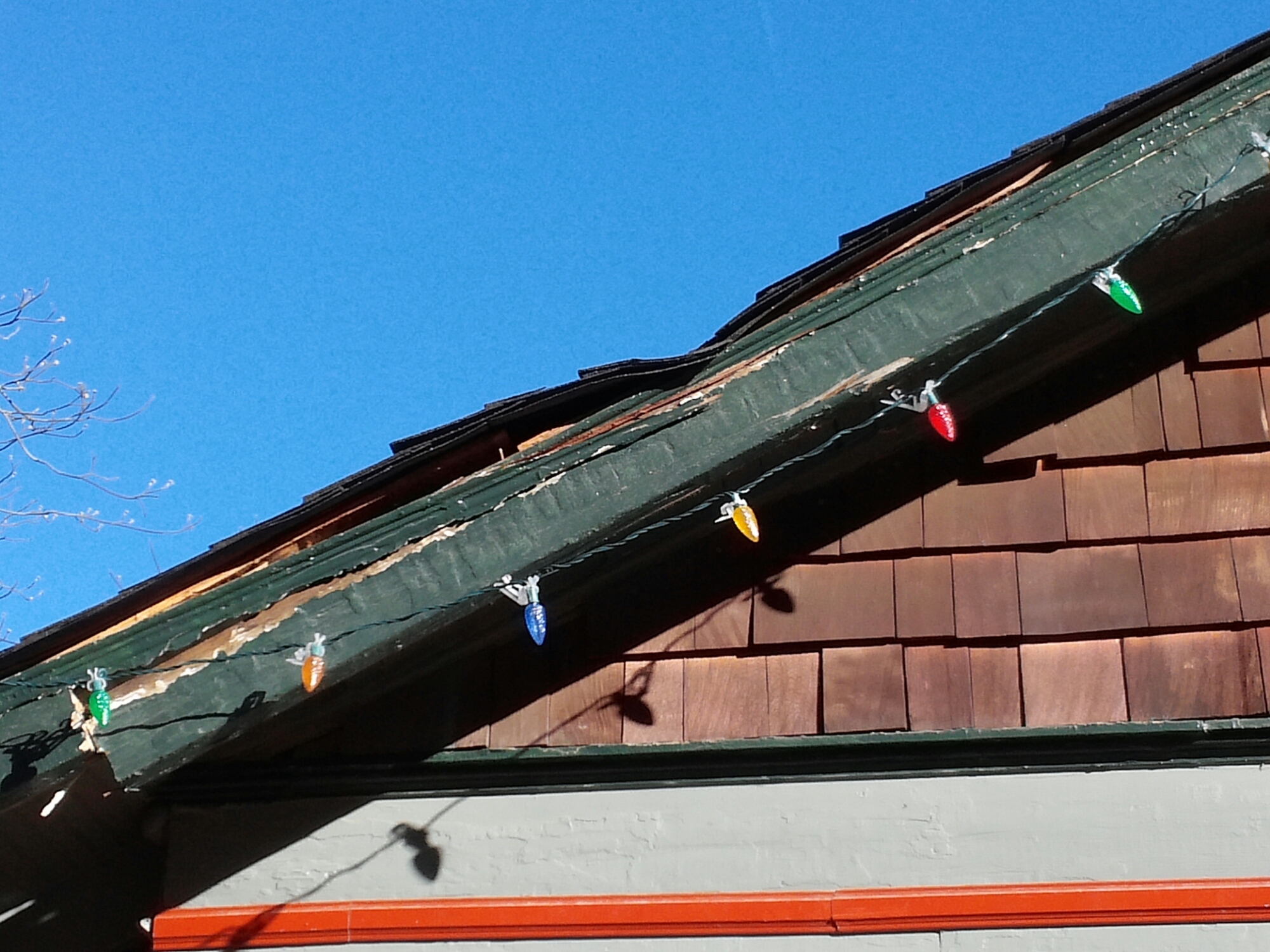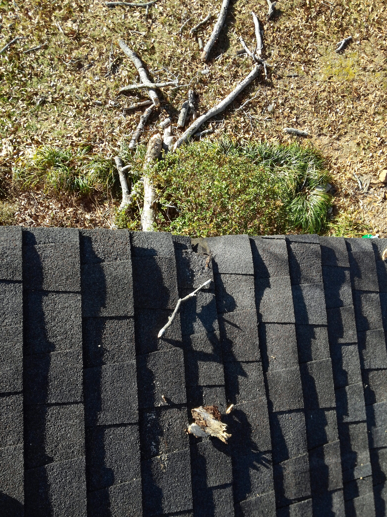 I climbed up on the roof this morning to check for holes and found that we got off pretty good, considering the size of the branch and the distance it had to travel to reach our porch. Now, the goal is to get the landlord next door to remove the rest of this tree, since we now have proof that it can still reach our house.