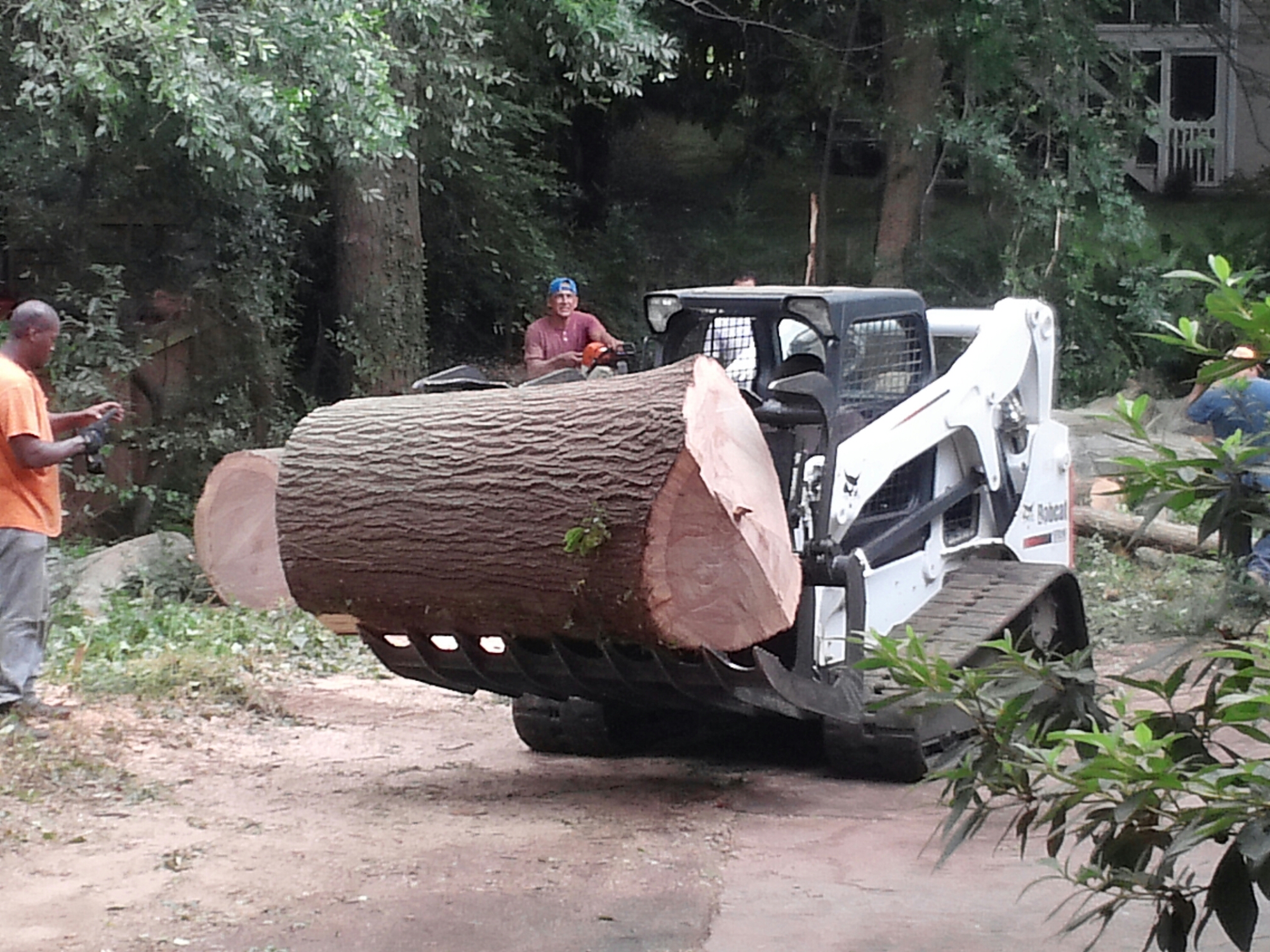 It is a massive piece of oak. The bobcat can safely carry 4500 lbs, and this chunk made the bobcat lift forward and scrape the ground with the grabber. The tree guy estimated that it’s 5000 lbs of oak. The car in the photo below gives a good size comparison.