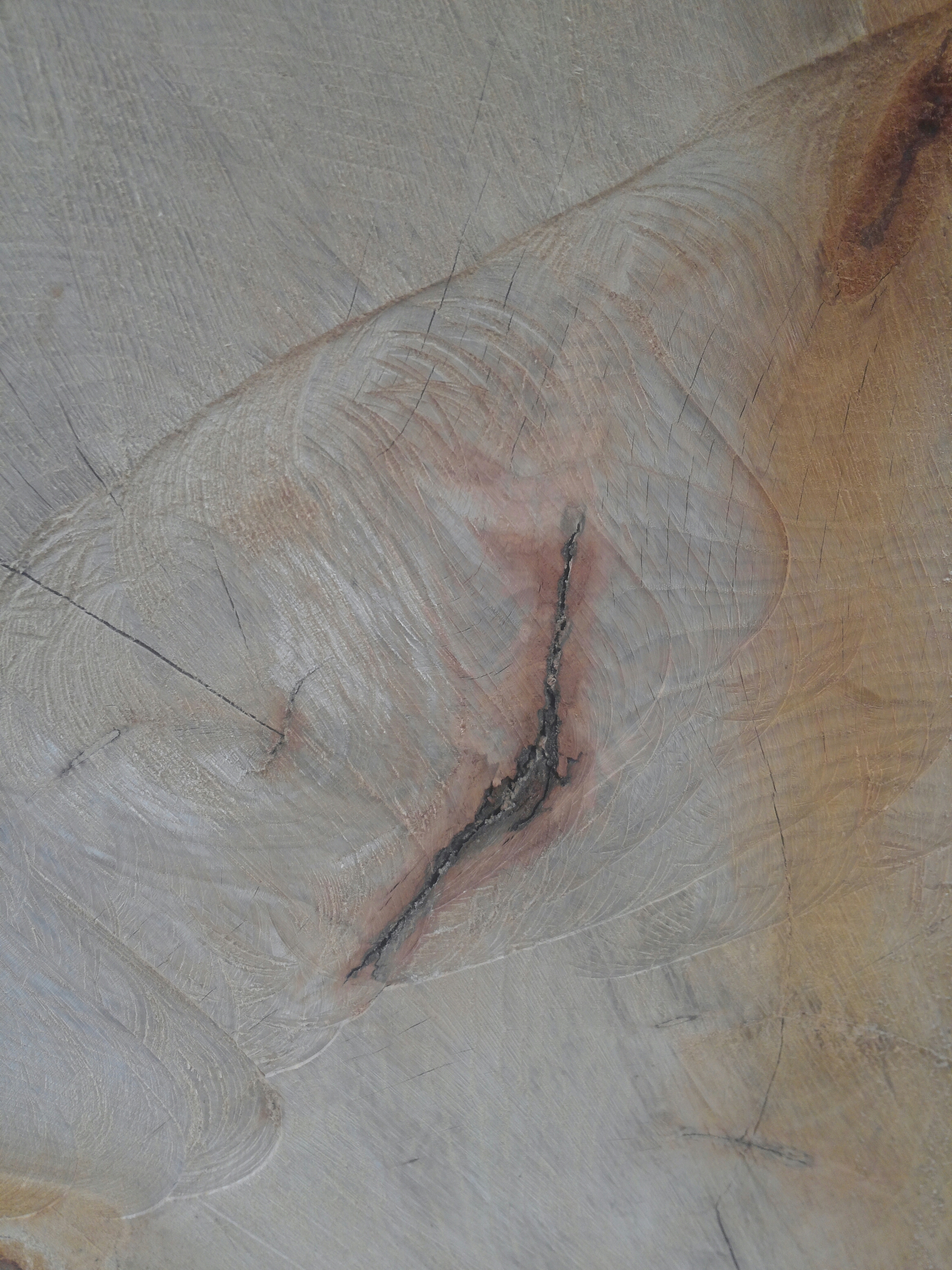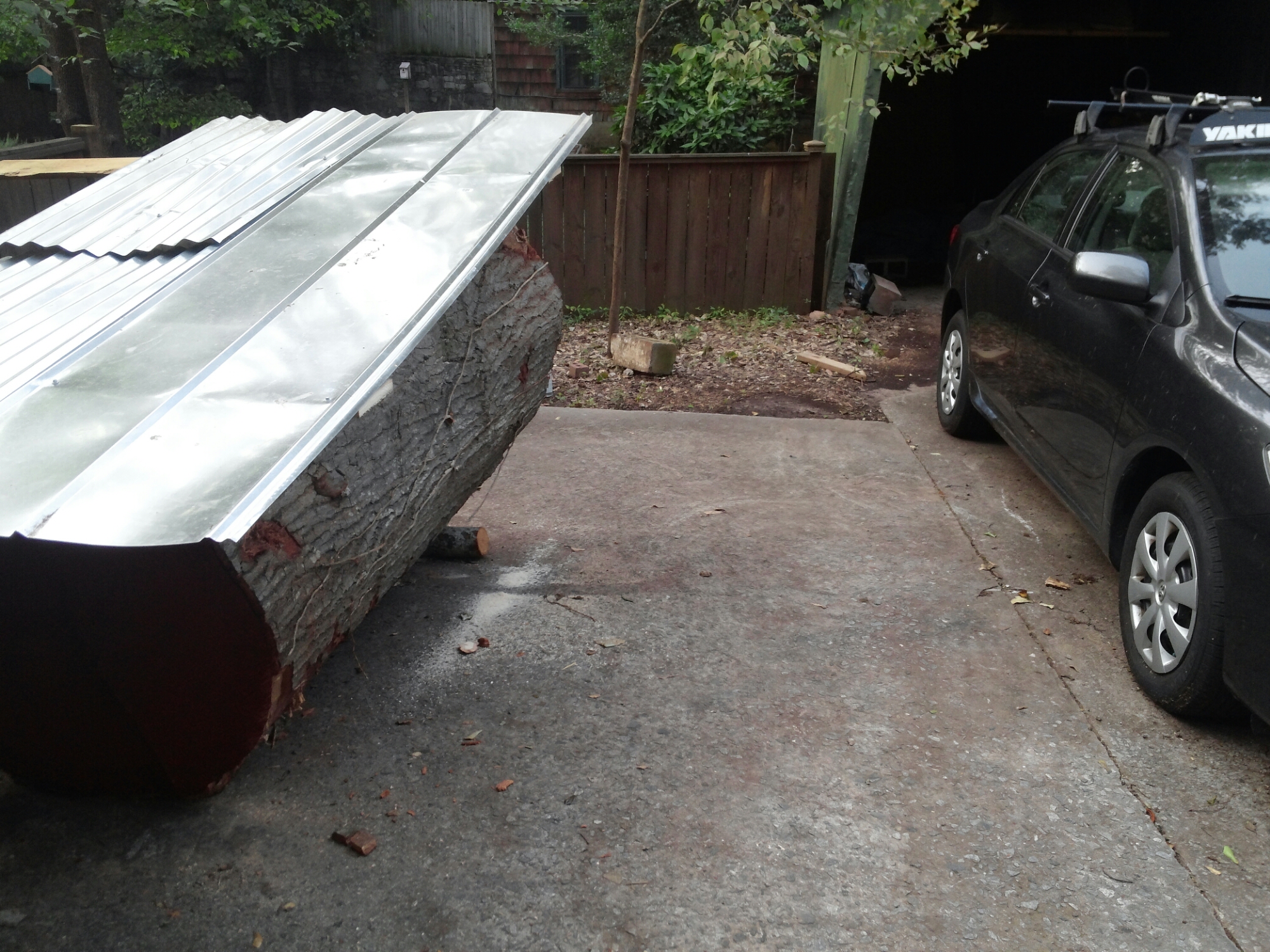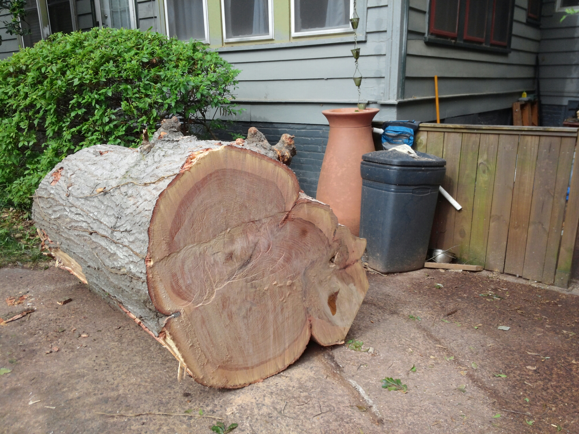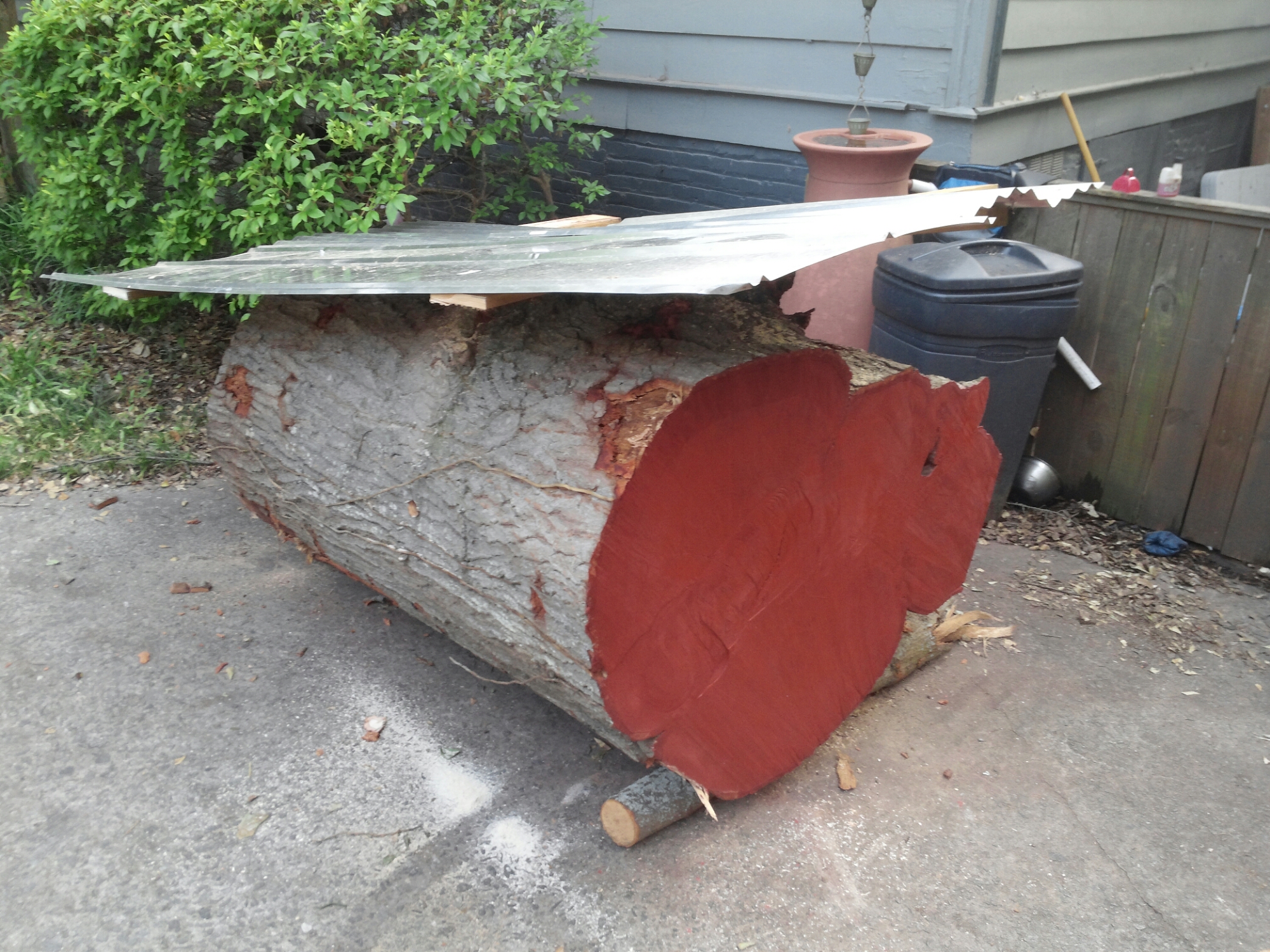 Our plan is let it sit in that spot for the next year and dry out slowly. I’ve painted the ends with latex paint to keep it from drying too fast and cracking. I’ve also built a (kinda crappy) hat for the log so it doesn’t get soaked by the huge downpours we’ve been having. Next summer, I plan on buying a 6 foot, 2-man timber saw to cut it into 4-inch slabs. Given its current dimensions, that’ll give us 15 slabs, ranging from oblong 54″x42″ to nearly circular 36″. We’ll sand them to a glassy smoothness, coat with varnish, and sell them.